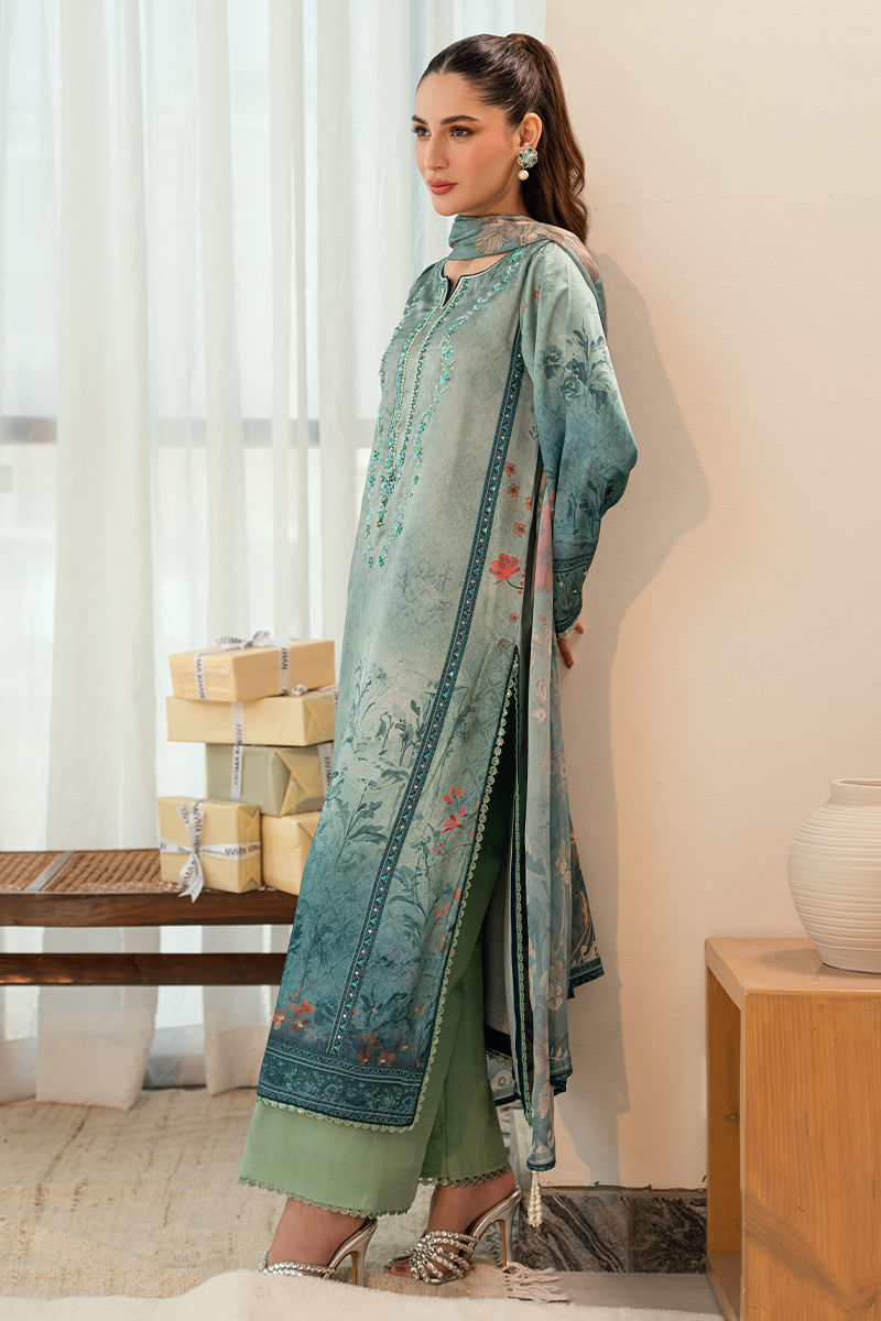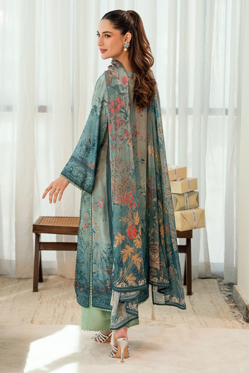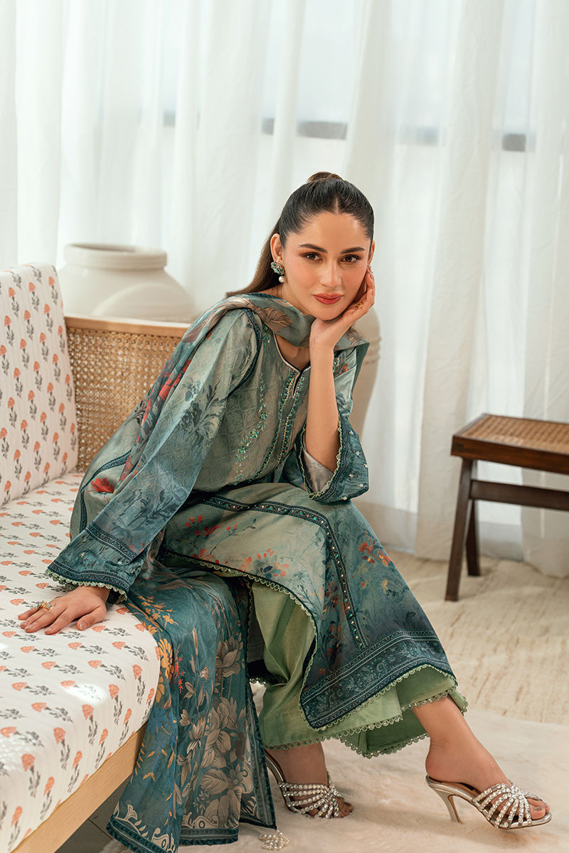Rendered in a rich teal hue, Aabroo features a beautifully printed kurta with delicate botanical motifs and finely embroidered detailing along the neckline and borders. The relaxed silhouette is balanced with subtle craftsmanship, making it both wearable and refined. Paired with culottes pants in a complementary tone, this ensemble is perfect for women who appreciate elegance with ease.