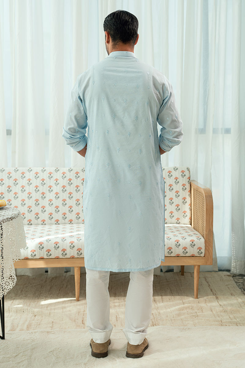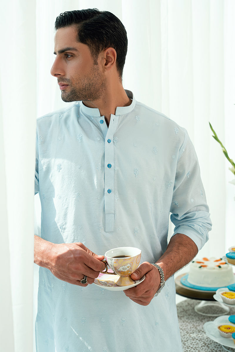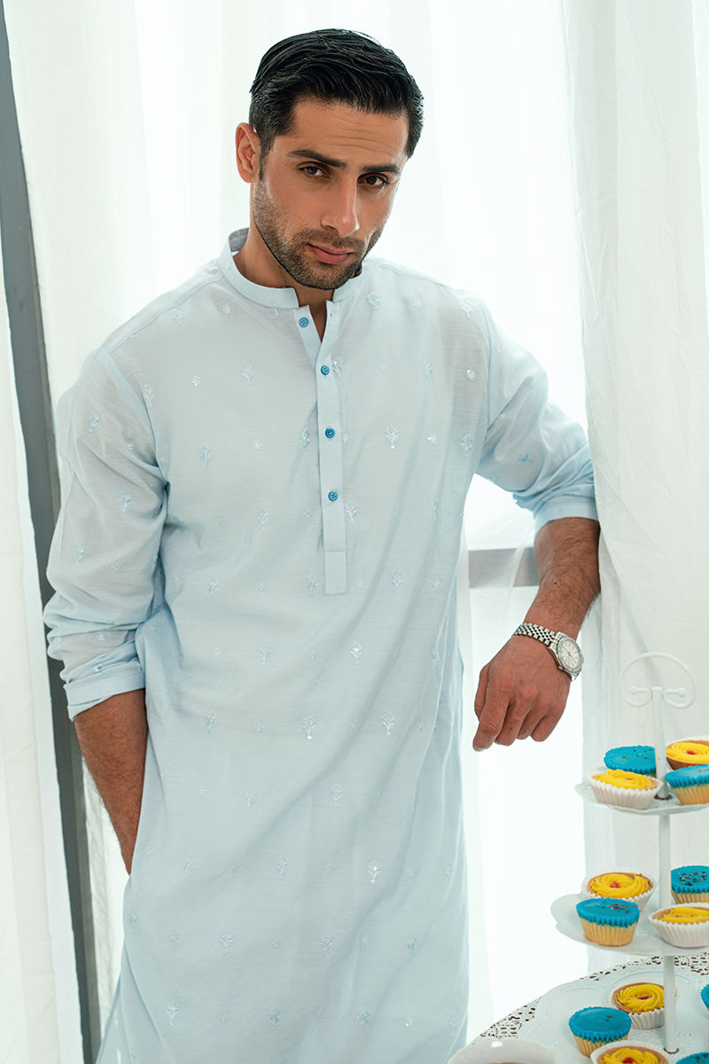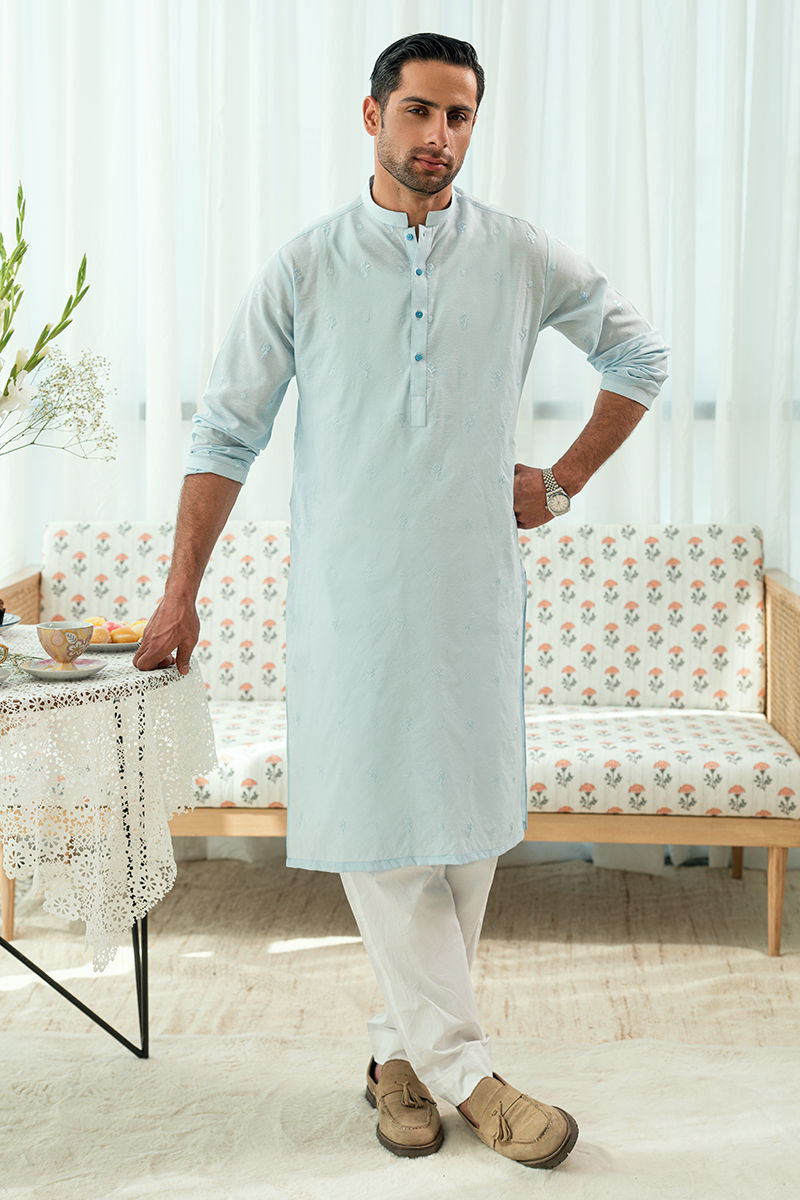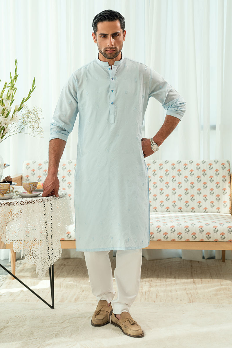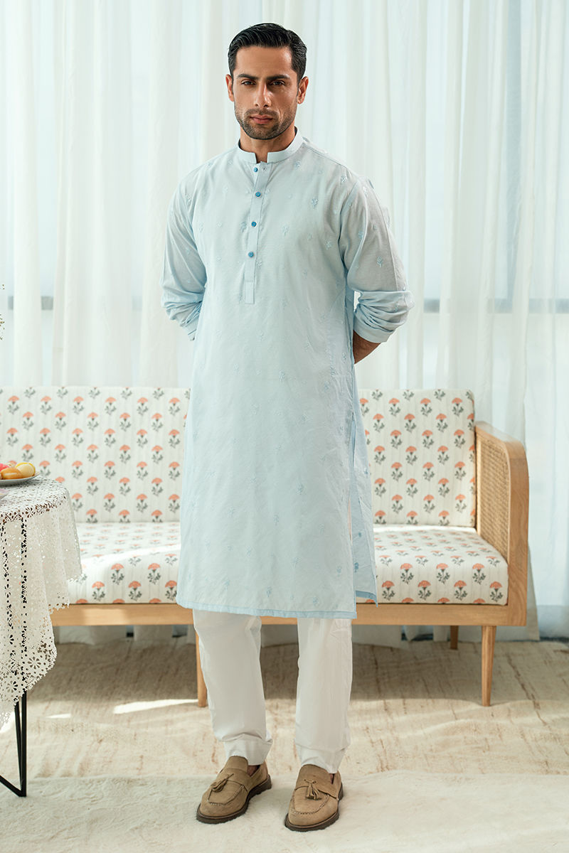 Rendered in a soft powder blue hue, this kurta is elevated with minimal self-embellishment scattered across the surface for a refined festive finish. The clean neckline and tailored fit offer effortless elegance, making it a versatile choice for both day and evening wear.