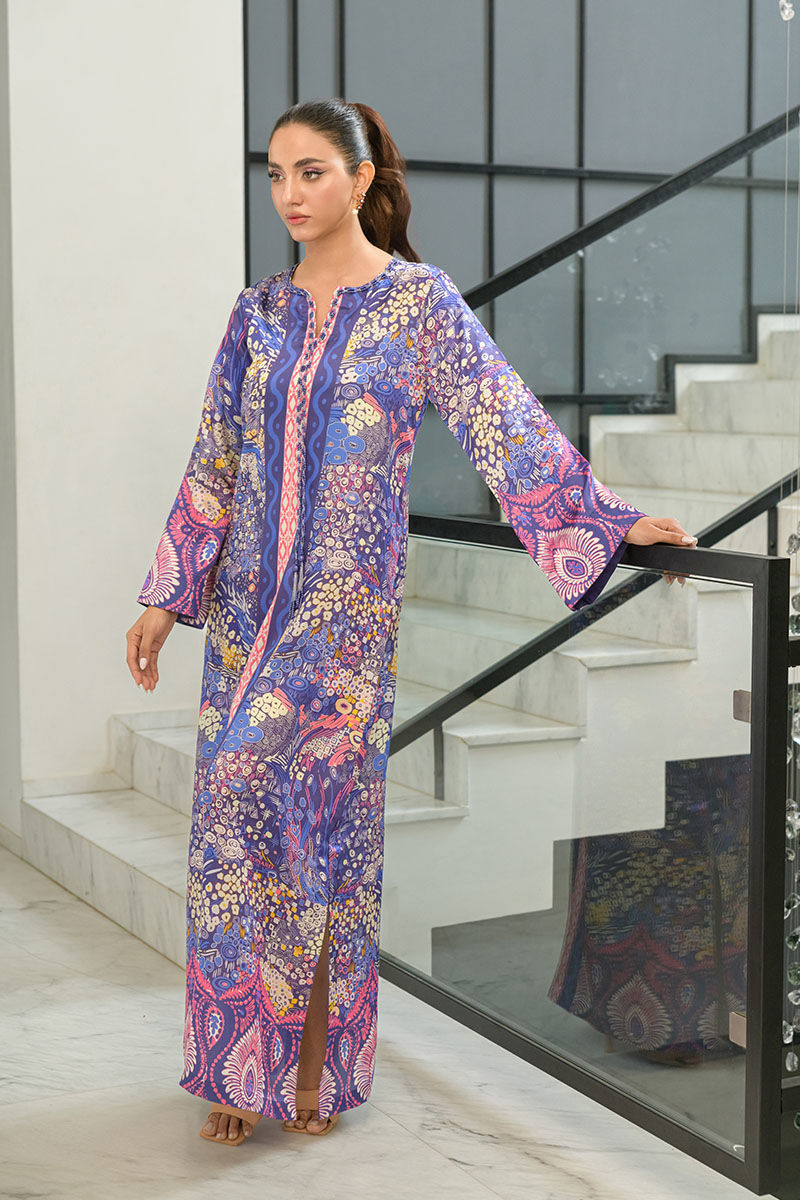 This modern article features a purple colored silk printed straight kaftan with colorful accents and purple pearls and beads details on the neckline and side slits and flared sleeves.