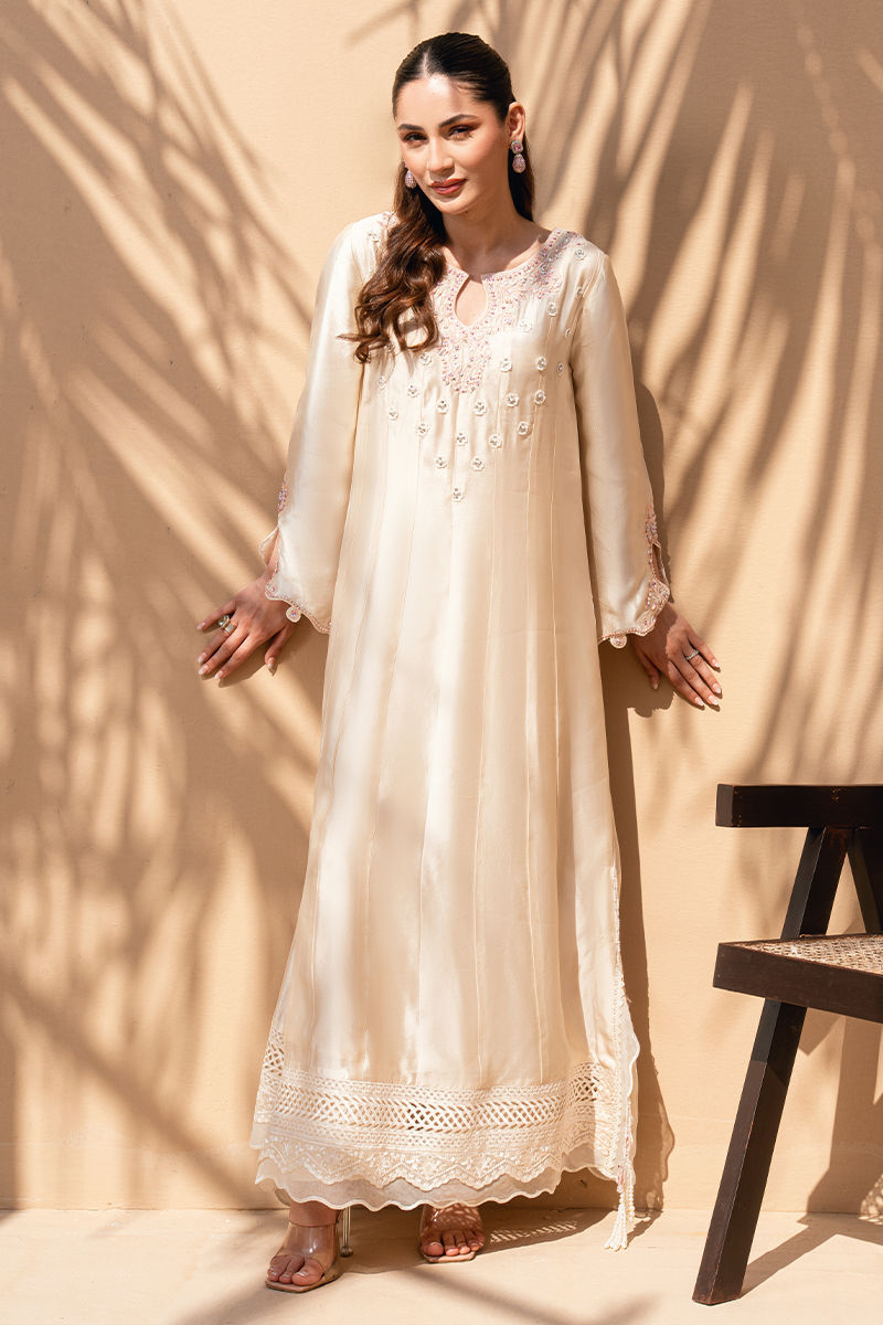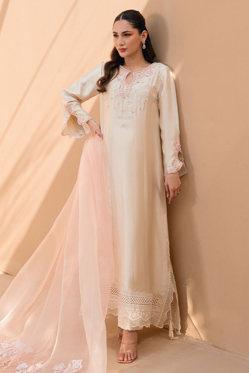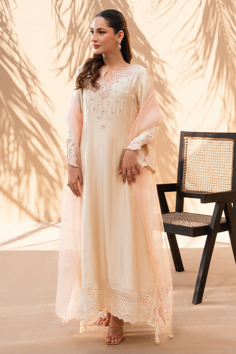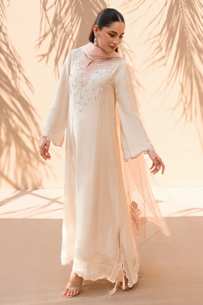 An ode to effortless grace, this ivory long silhouette exudes quiet femininity and refined charm. Crafted in a fluid, lightweight fabric, the outfit features delicate blush-toned thread embroidery scattered across the bodice, complemented by an intricately detailed neckline for a subtle yet elegant focal point. The sleeves are finished with fine embroidered accents, while the hemline is adorned with lace detailing that adds depth and texture to the flowing silhouette. Paired with a sheer blush dupatta, this ensemble is perfect for daytime festivities, garden gatherings, or intimate celebrations—where elegance speaks softly yet leaves a lasting impression.