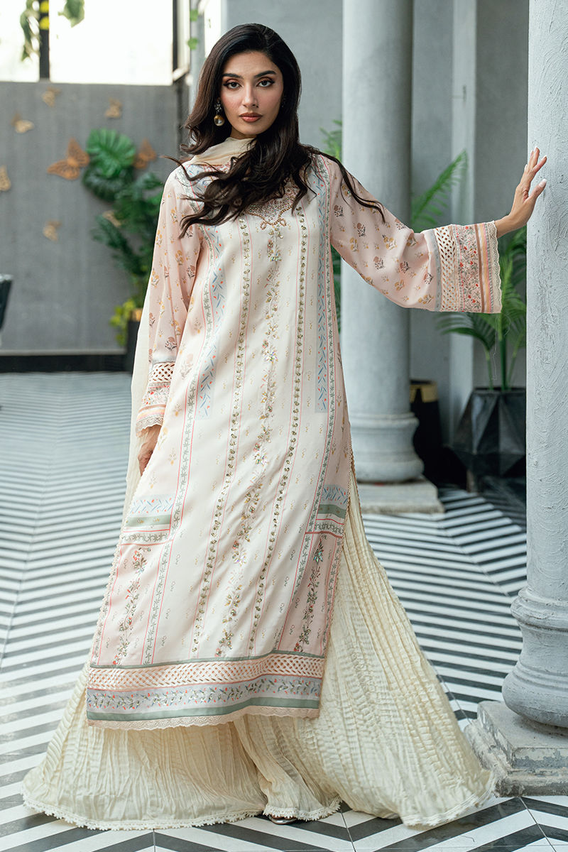 Paired with a matching digitally printed dupatta that complements the pastel palette and flowing crushed sharara pants in a coordinated ivory tone, this ensemble offers elegant movement and timeless appeal. Ideal for festive occasions, Eid celebrations, and sophisticated daytime events.