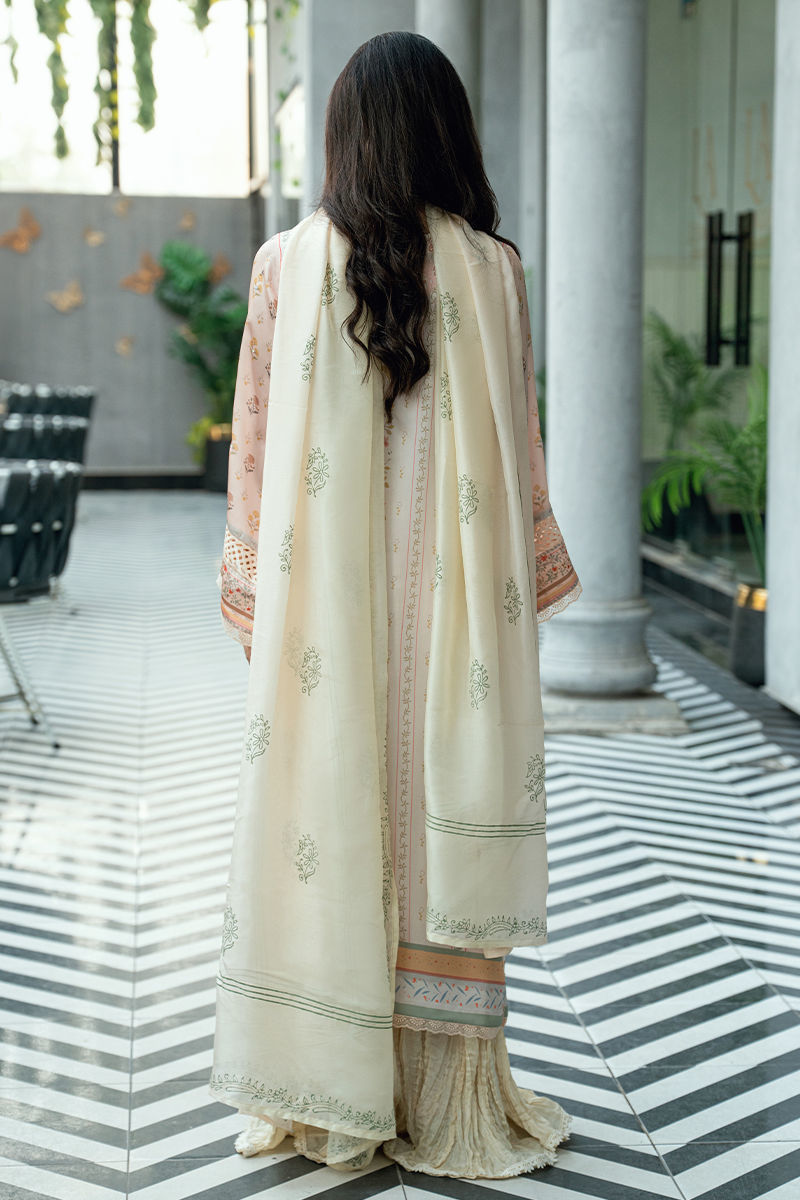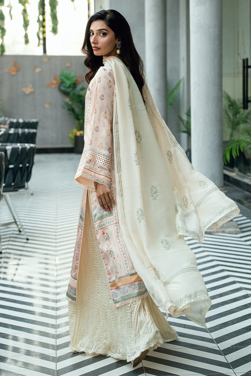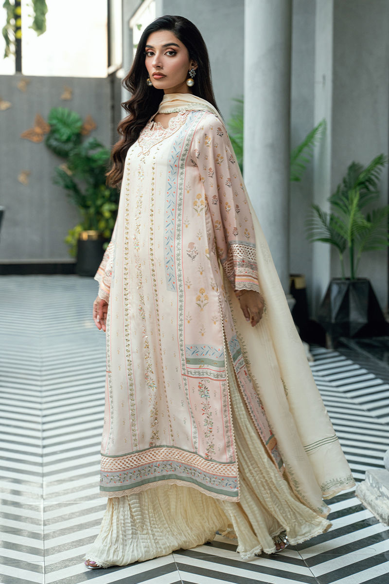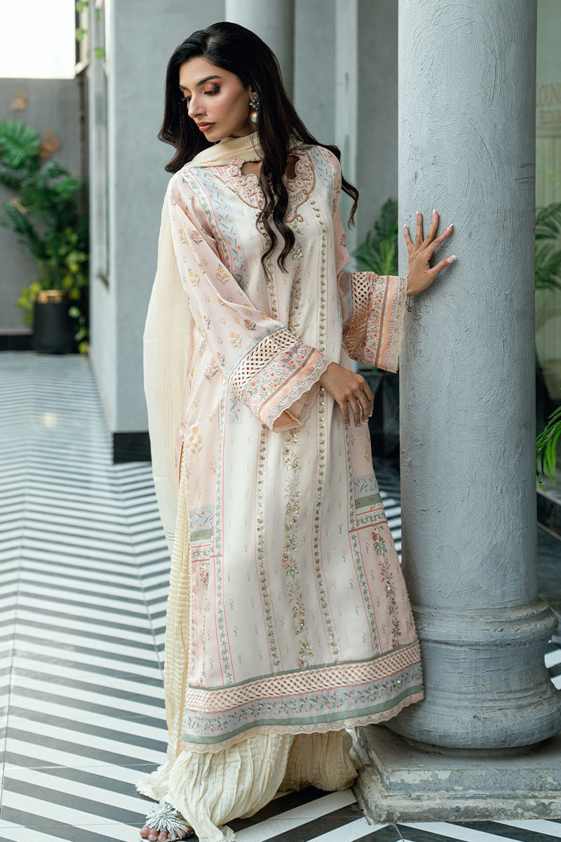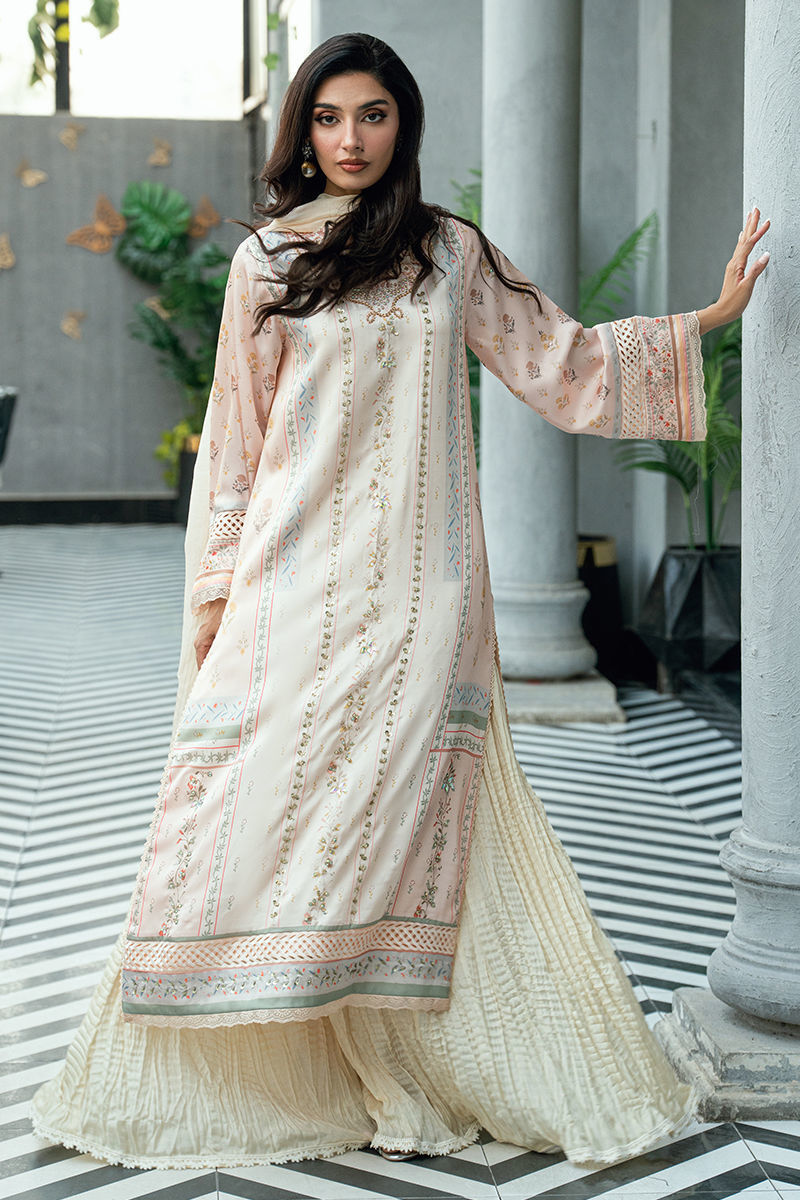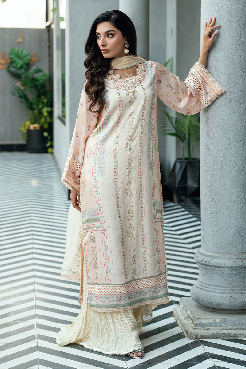 A graceful three-piece ensemble crafted in a soft ivory-cream base, adorned with delicate digital floral prints in subtle tones of blush pink, pastel peach, powder blue, mint green, and muted beige. The shirt is elevated with fine handwork embellishments along the front and neckline, adding refined artisanal detail without overpowering the design. Paired with a matching digitally printed dupatta that complements the pastel palette and flowing crushed sharara pants in a coordinated ivory tone, this ensemble offers elegant movement and timeless appeal. Ideal for festive occasions, Eid celebrations, and sophisticated daytime events. Includes: Digital-printed shirt, printed dupatta & crushed sharara pants. Highlights • Soft ivory base with pastel digital florals • Hand-embellished neckline and front detailing • Matching printed dupatta • Crushed sharara for fluid drape and comfort • Elegant, breathable, and refined silhouette A thoughtfully crafted design for women who value delicate handwork, soft color stories, and understated luxury.