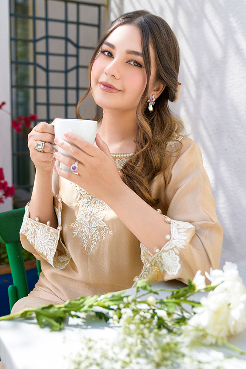 This sophisticated article features and beige colored long shirt in pure sheesha silk with an embroidered neckline and borders finished with cut work and loops and pearls details all finished with cotton silk straight pants and a pure organza dupatta with embroidered cut work.