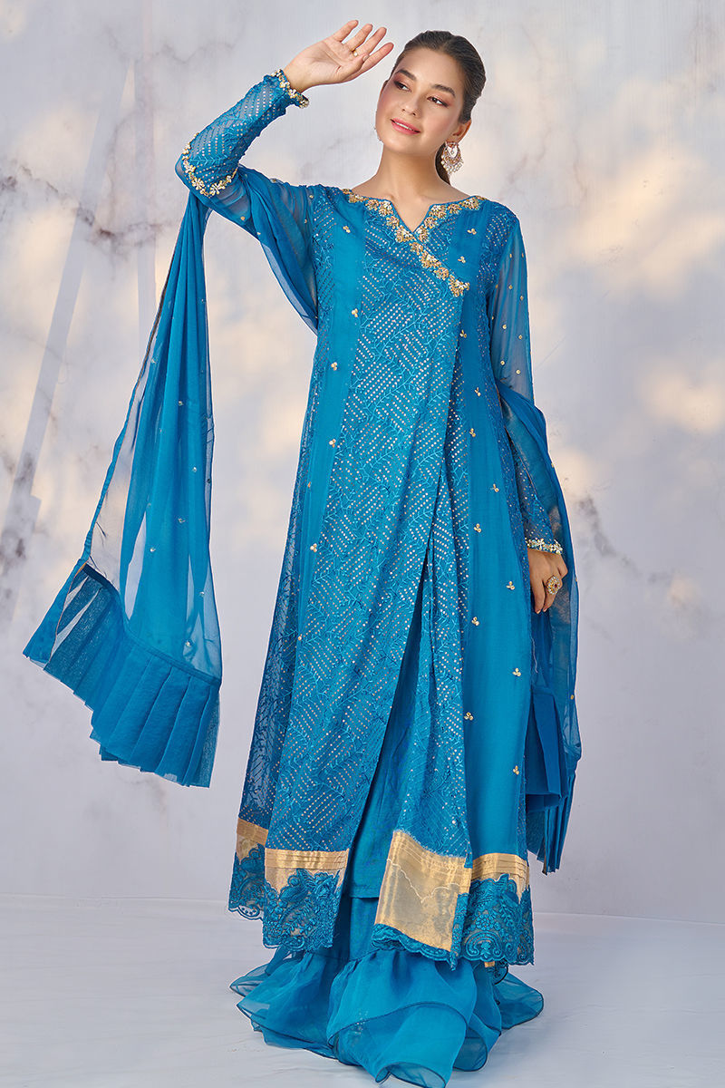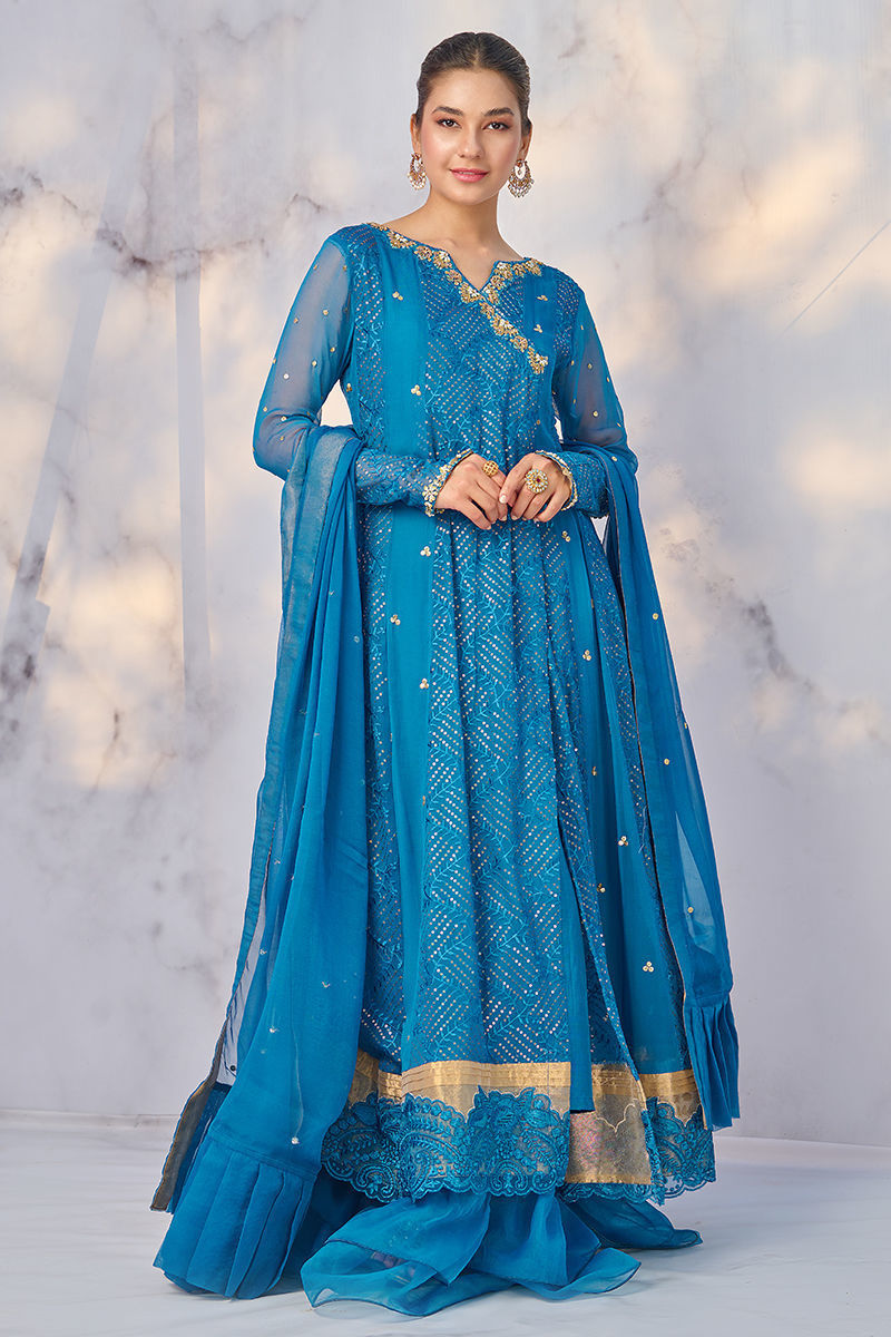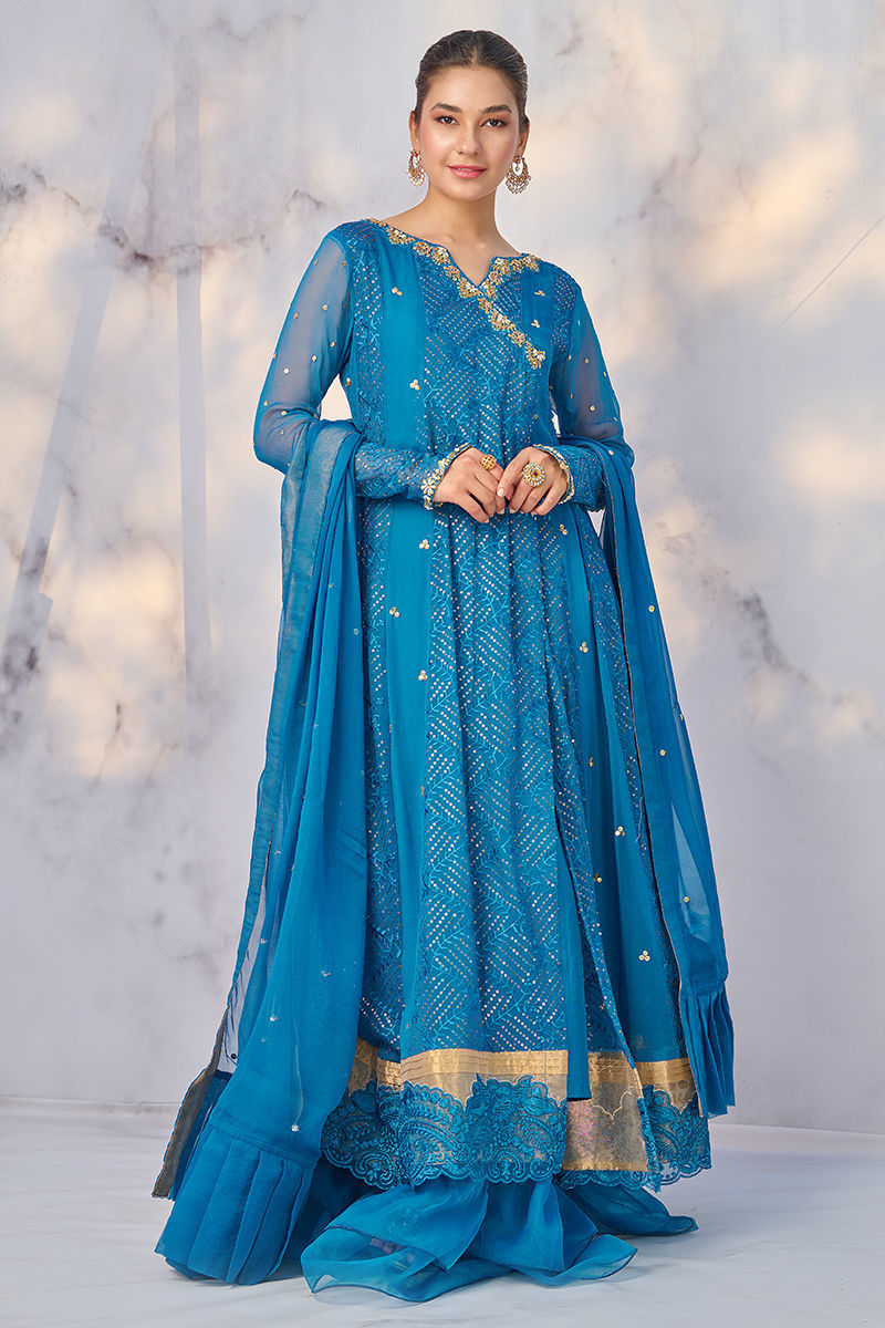 Bisma with its stunning silhouette features an embroidered sequined chiffon agharka shirt adorned with stunning hand embroidery on the neckline and sleeves.