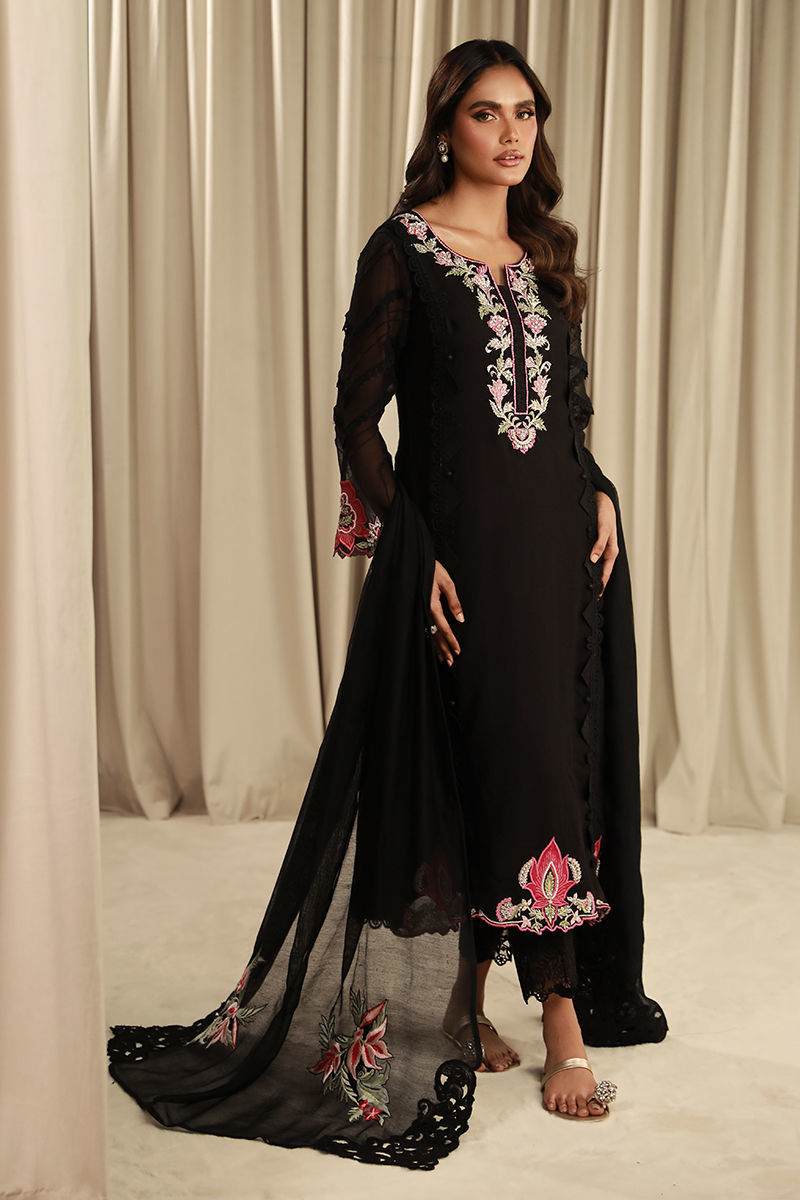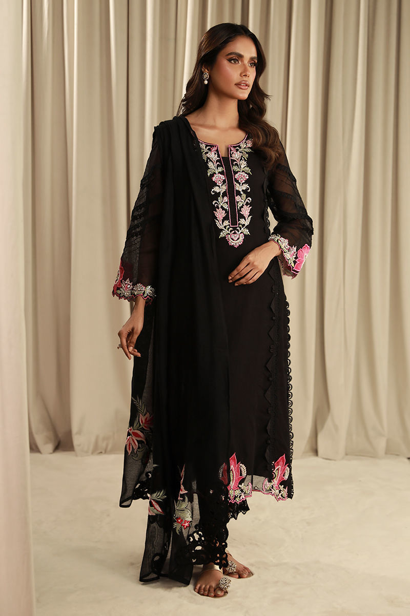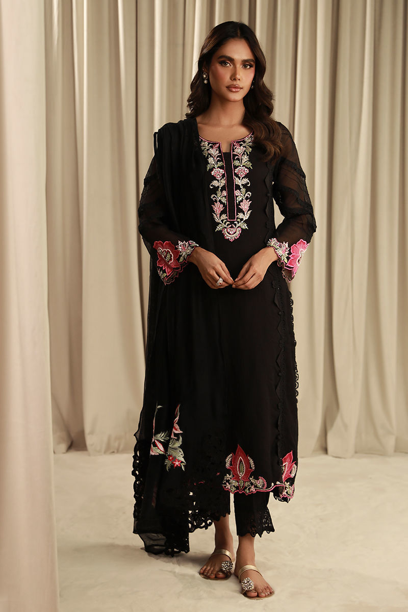This article features a black Khaadi net straight shirt which is machine embroidered with contrasting colors and embellished with laces, sequins, pearls, and pin-tucks finished with machine-embroidered pants and a Khaadi net dupatta.