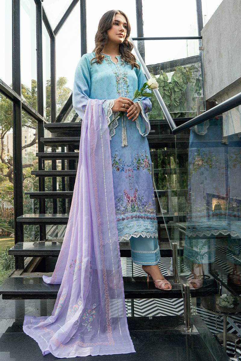 Digital-Printed Blue Long Shirt with Embellishments, Block-Print Dupatta & Culottes This refined three-piece ensemble features a soft sky-blue long shirt adorned with delicate digital prints inspired by floral and ornamental motifs. The front is beautifully highlighted with hand embellishments and subtle embroidery, adding a graceful sparkle and artisanal depth to the design. Intricate lace detailing at the sleeves and hem enhances the shirt’s elegant finish. The look is paired with a contrasting block-printed dupatta in soothing shades of lavender and soft lilac, lending texture and traditional charm. Completing the ensemble are matching culottes-style pants in a coordinated blue tone, finished with refined borders for a polished silhouette. Perfect for festive daywear, Eid celebrations, and semi-formal gatherings, this outfit blends modern printing with classic craftsmanship. Product Highlights • Digitally printed long shirt in sky blue • Hand embellishments and delicate embroidery on front • Lace detailing on sleeves and hem • Block-printed dupatta in lavender tones • Matching culottes-style pants • Soft, breathable fabric with elegant drape A timeless design created for women who appreciate soft colors, intricate detail, and effortless sophistication.