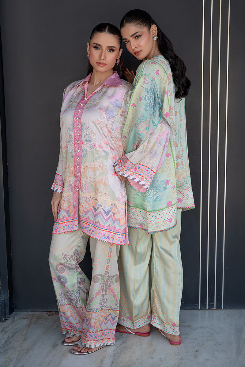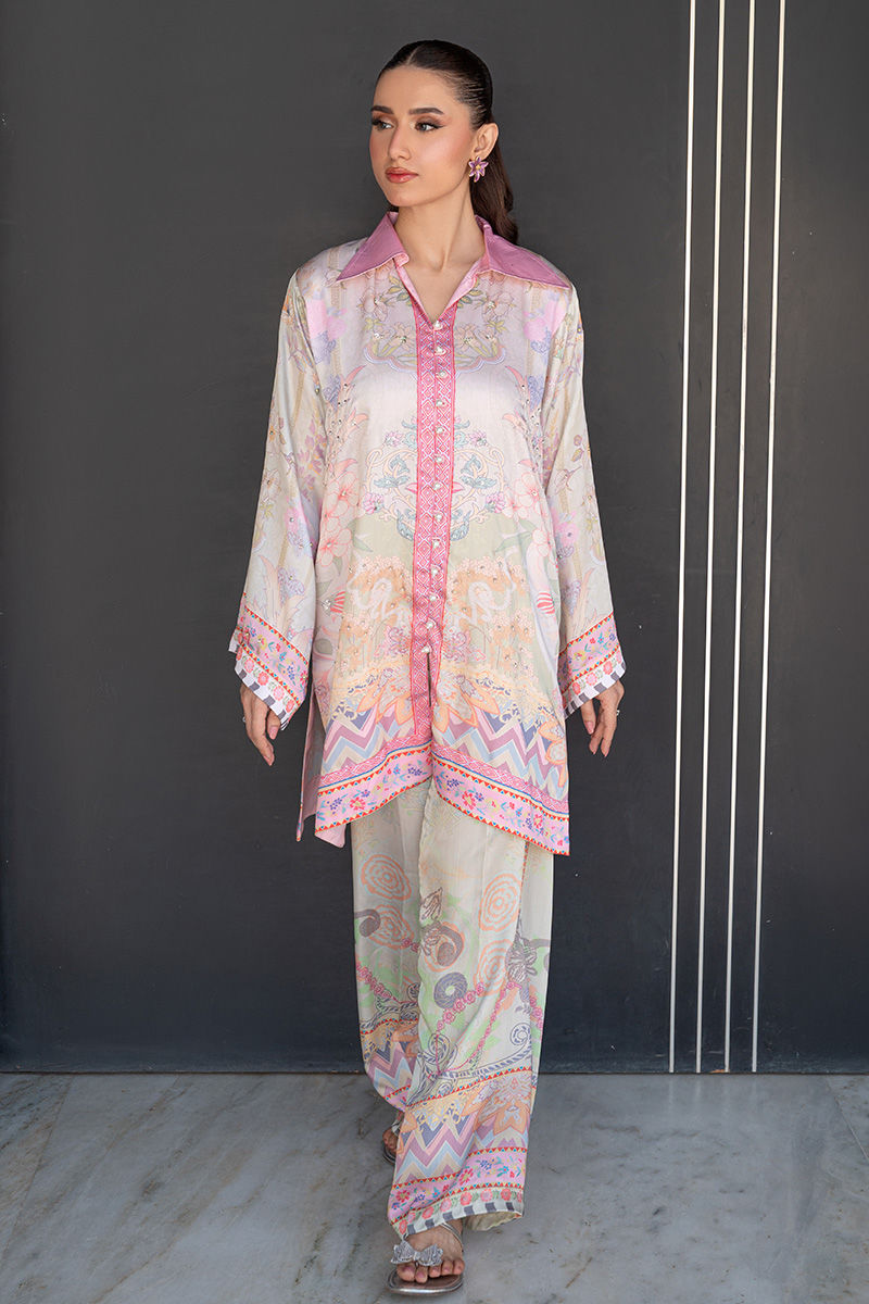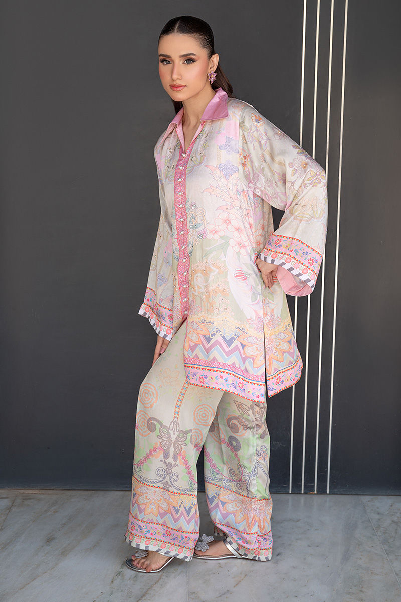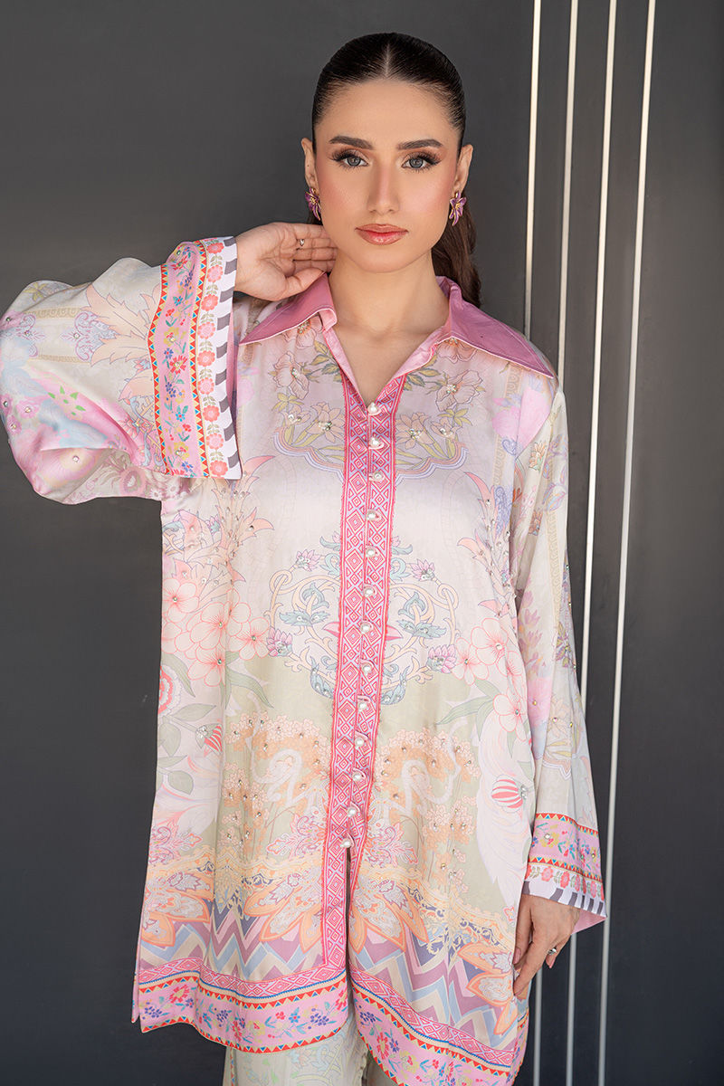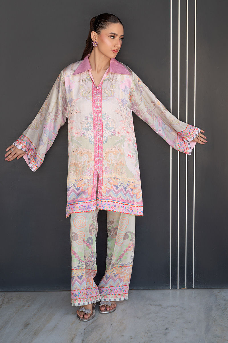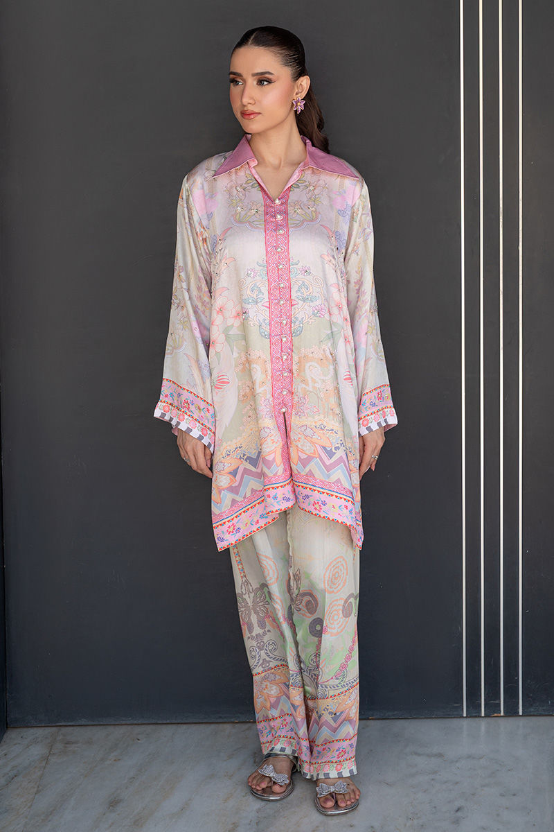 A modern take on florals, Blush Orchard features a soft pink base brought to life with intricate digital prints of trees and blooming florals. The front-open collared shirt, delicately finished with pearl detailing, adds a polished edge to the relaxed co-ord silhouette. Effortlessly chic and versatile, it transitions beautifully from daytime outings to intimate gatherings. Length: 33" to 35"