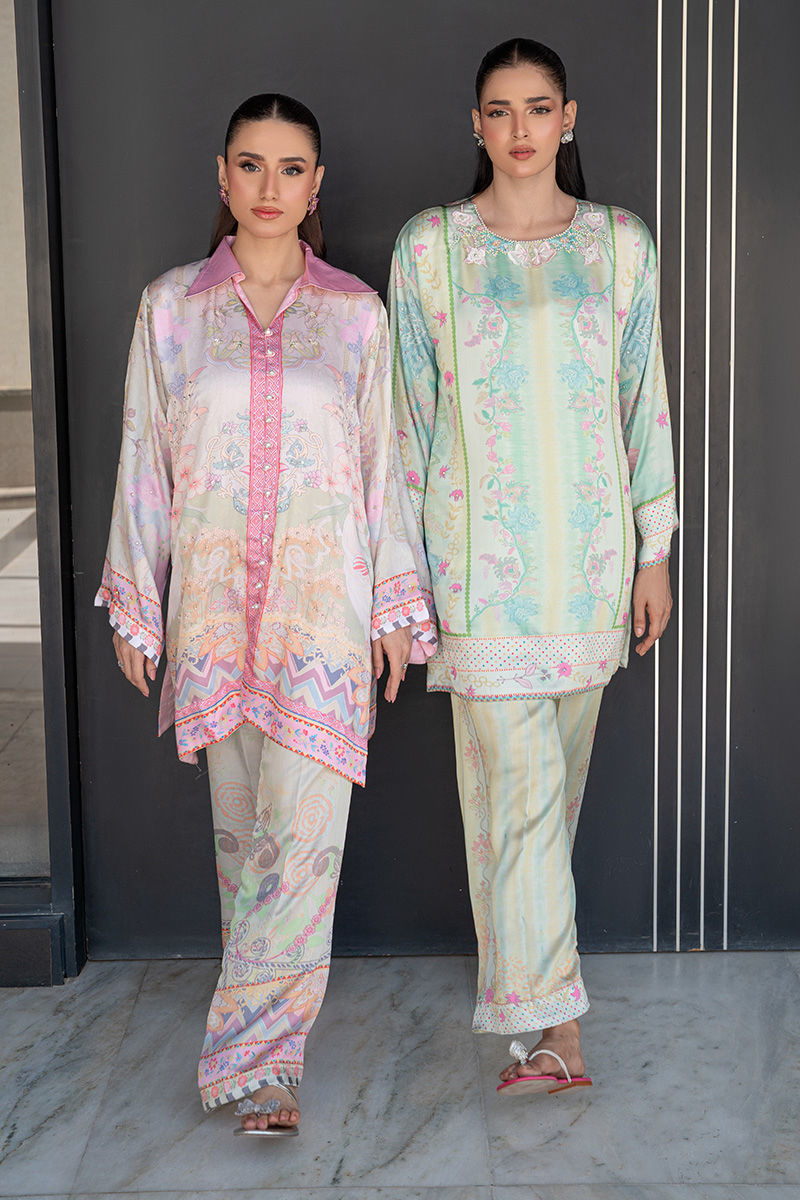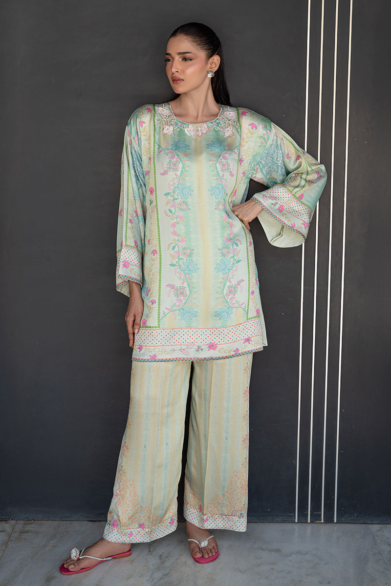 Rendered in a soothing mint hue, this co-ord set features a tapestry of floral prints enhanced with exquisite 3D embroidery and fine handwork. The interplay of texture and print adds depth and dimension, making it a refined statement piece for modern festive dressing. Length: 33" to 35"