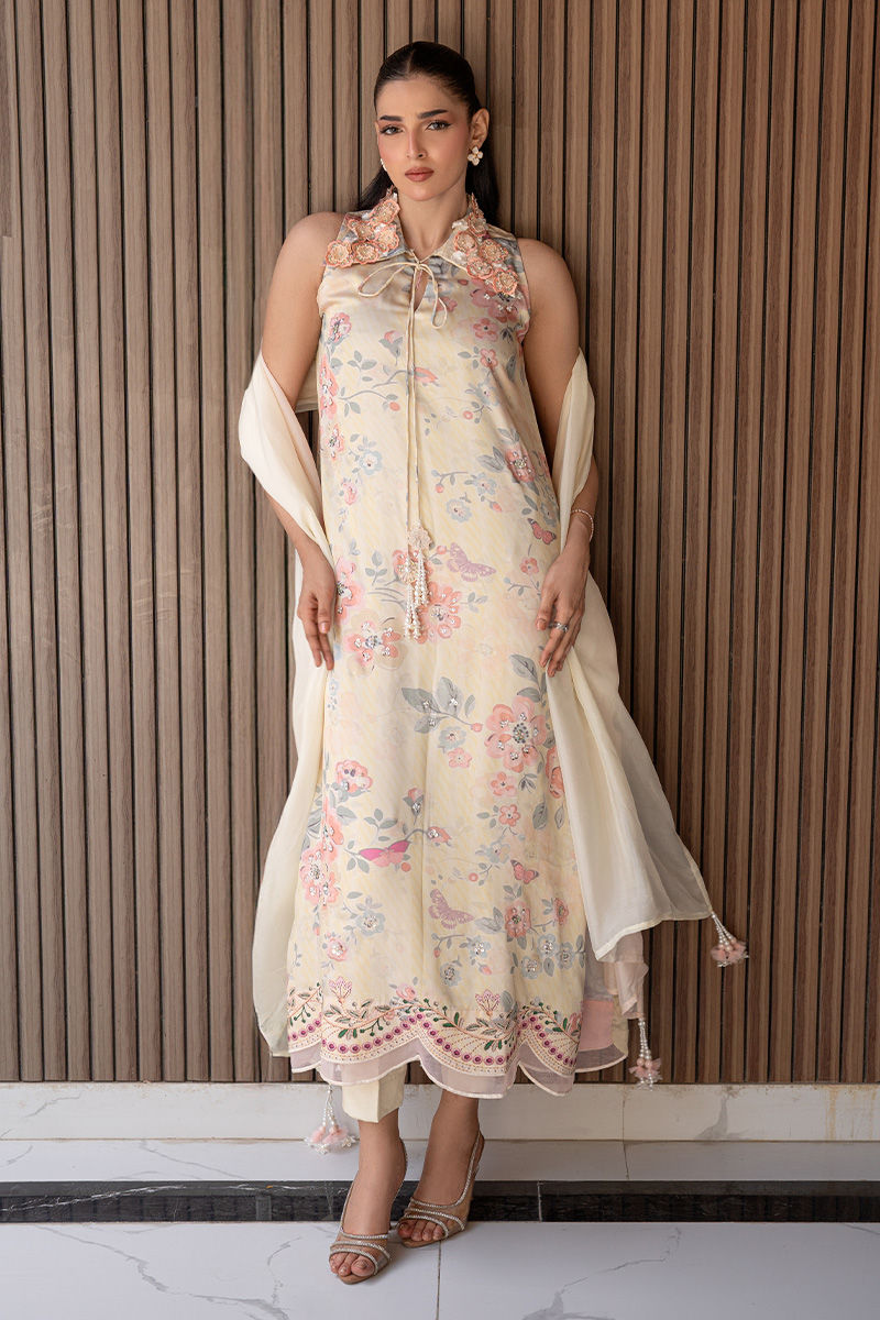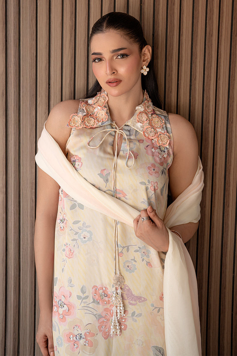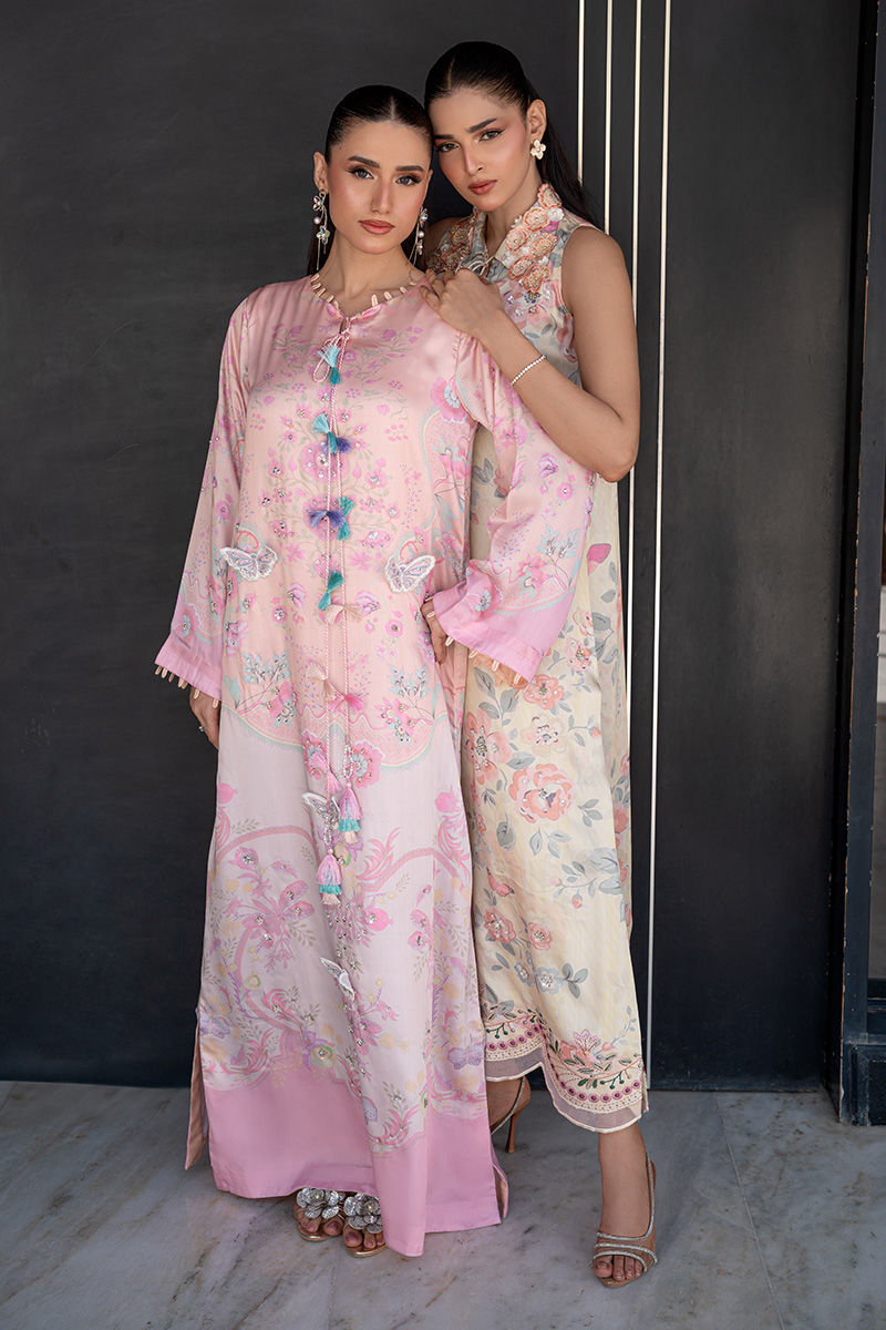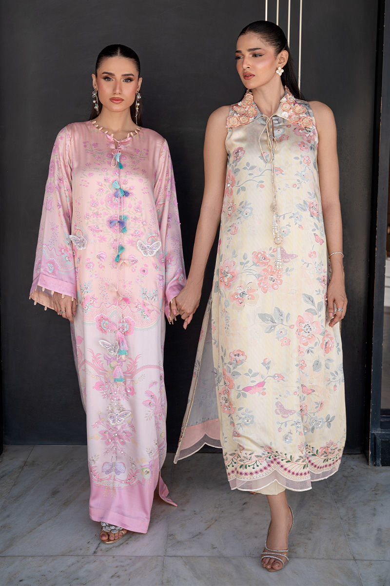 A modern take on florals, Blush Orchard features a soft pink base brought to life with intricate digital prints of trees and blooming florals. The front-open collared shirt, delicately finished with pearl detailing, adds a polished edge to the relaxed co-ord silhouette. Effortlessly chic and versatile, it transitions beautifully from daytime outings to intimate gatherings. Length: 48" to 50"