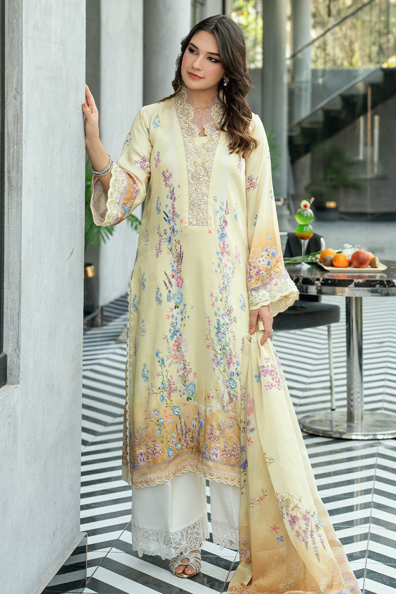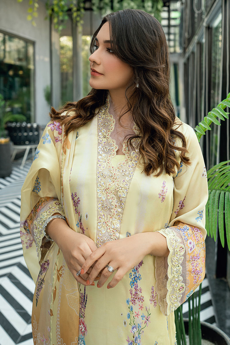 A refined three-piece ensemble featuring a soft butter-yellow digital-printed shirt adorned with delicate floral motifs in pastel blue, lilac, blush pink, peach, and hints of mint green. The neckline is enhanced with subtle embellishments, adding an elegant focal point without overwhelming the design.
