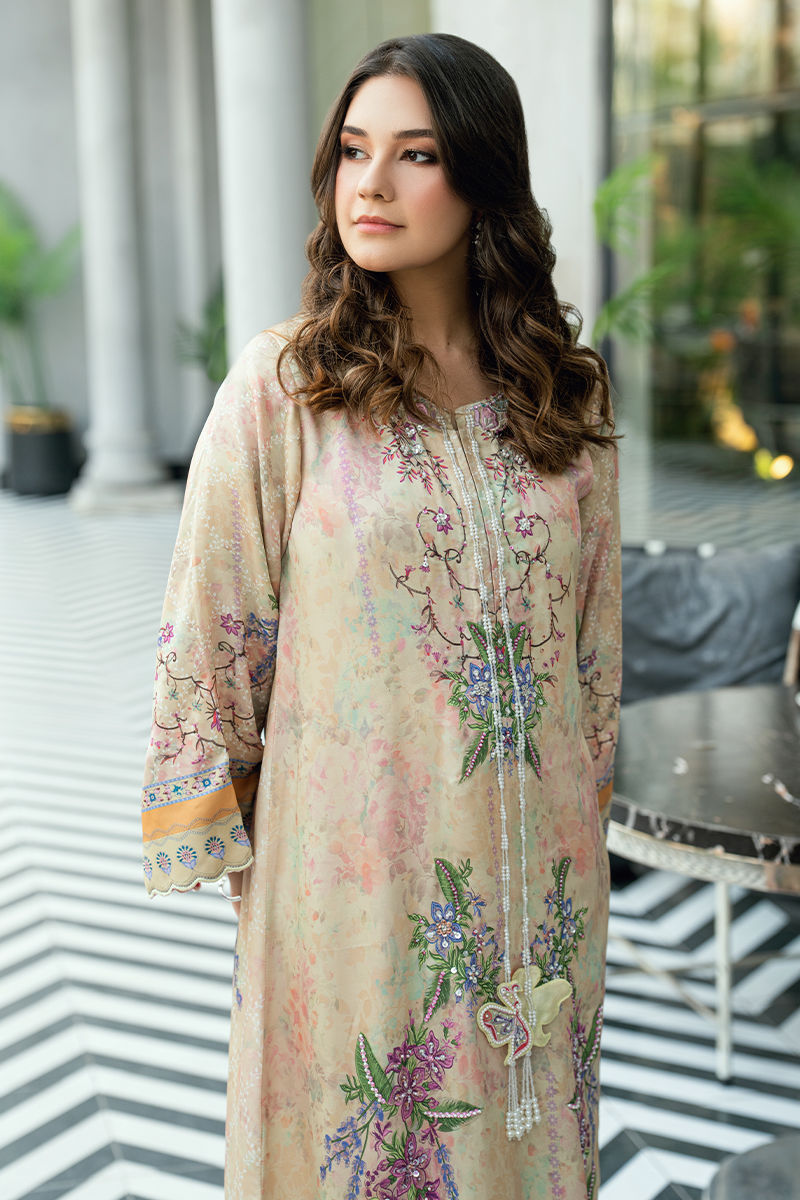 This graceful kaftan is designed on a soft beige–peach base, beautifully brought to life with a delicate digital floral print in harmonious shades of lavender, lilac, soft purple, blush pink, muted rose, sage green, and hints of soft blue. The color palette feels warm, romantic, and soothing—perfectly balanced for refined daywear.