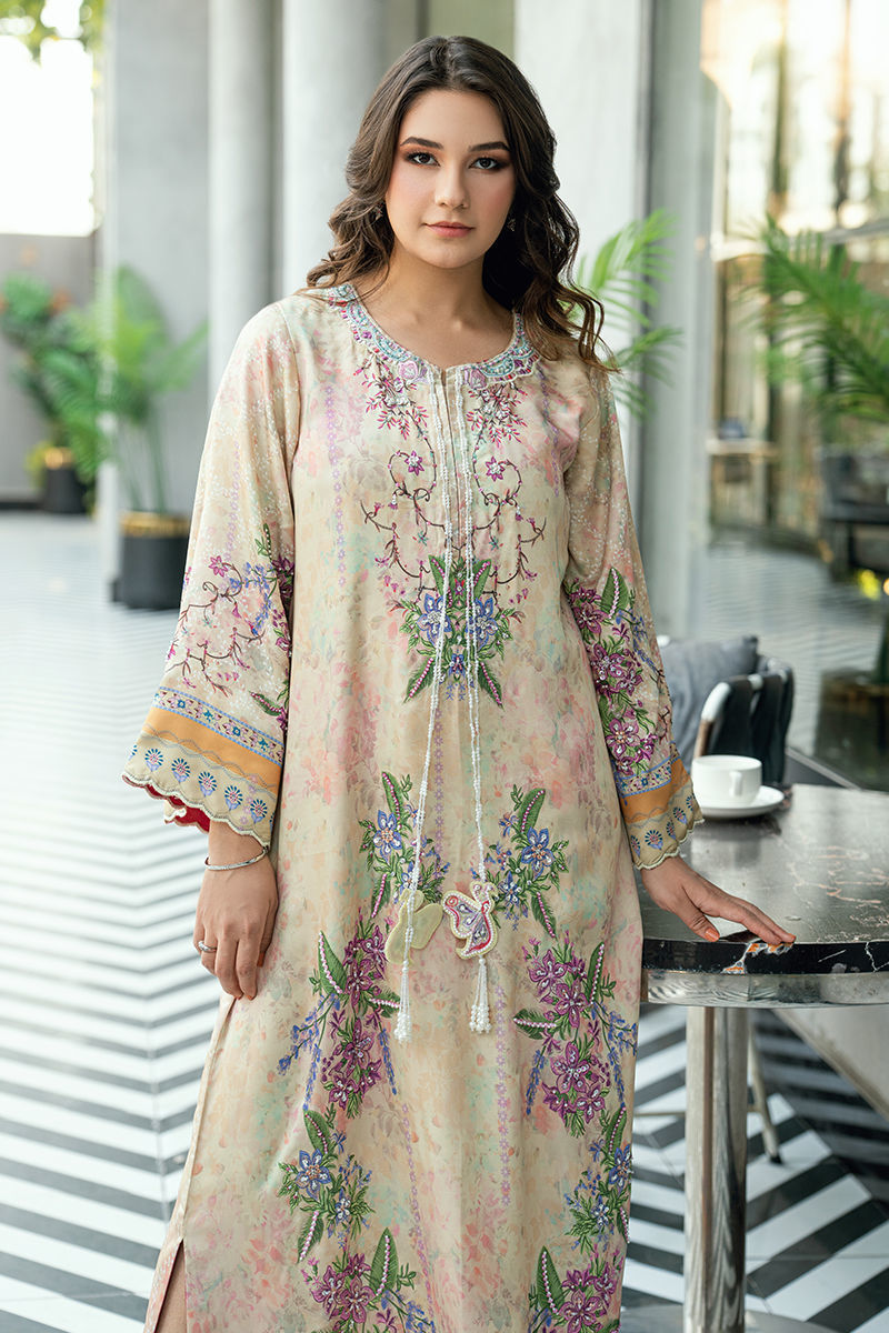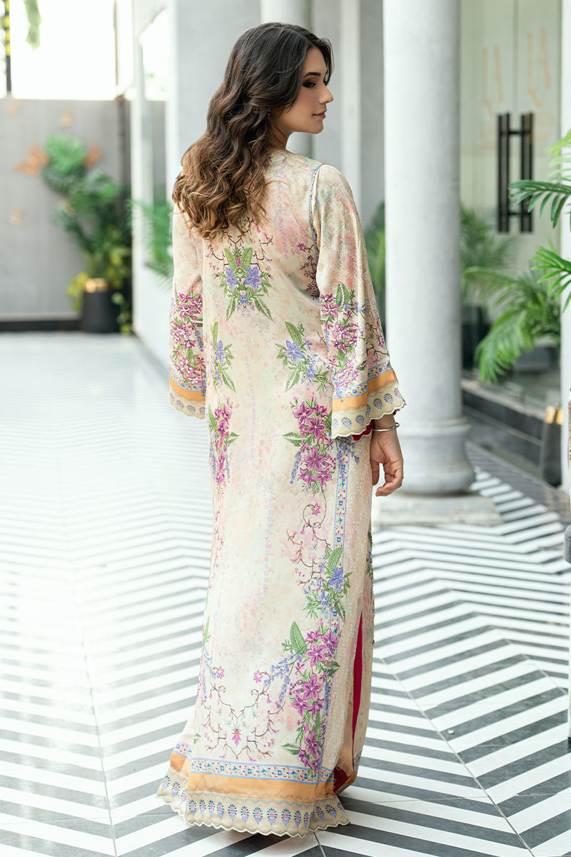 This graceful kaftan is designed on a soft beige–peach base, beautifully brought to life with a delicate digital floral print in harmonious shades of lavender, lilac, soft purple, blush pink, muted rose, sage green, and hints of soft blue. The color palette feels warm, romantic, and soothing—perfectly balanced for refined daywear. The neckline is the focal point, adorned with elegant embellishments and butterfly-shaped pearl tassels that add movement, charm, and a subtle touch of luxury. Fine embellishment details are thoughtfully placed across the front, enhancing the floral print without overwhelming the silhouette. The kaftan is finished with coordinated printed borders at the hem and sleeves in soft peach, pastel blue, and gentle gold accents, completing the look with polished finesse. Fluid in drape and effortless in wear, this kaftan is ideal for festive lunches, Eid gatherings, and elegant daytime occasions. Product Highlights • Kaftan silhouette with a relaxed, graceful fall • High-definition digital floral print • Color palette: beige–peach base with lavender, lilac, blush pink, rose, sage green, soft blue, and pastel accents • Embellished neckline with butterfly pearl tassels • Subtle embellishment detailing on front • Printed borders on sleeves and hem • Comfortable, breathable, and elegant A timeless kaftan crafted for women who appreciate soft color stories, delicate detailing, and understated luxury. . Kaftan Length 52 to 54 inches