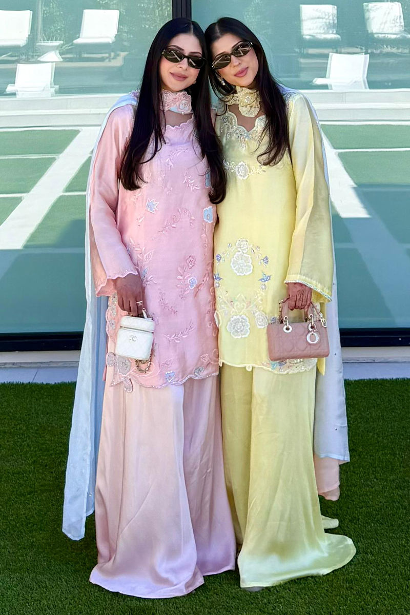 Delicate and dreamlike, this blush-toned ensemble captures the romance of spring in full bloom. The sleeveless straight silhouette is adorned with intricate floral embroidery in soft pastel hues, lending an ethereal charm to the design. Paired with fluid matching trousers and a sheer dual-toned dupatta in powder blue and blush, the look flows effortlessly with every movement. A refined neckline detail completes this graceful ensemble, making it ideal for daytime festivities and intimate celebrations.