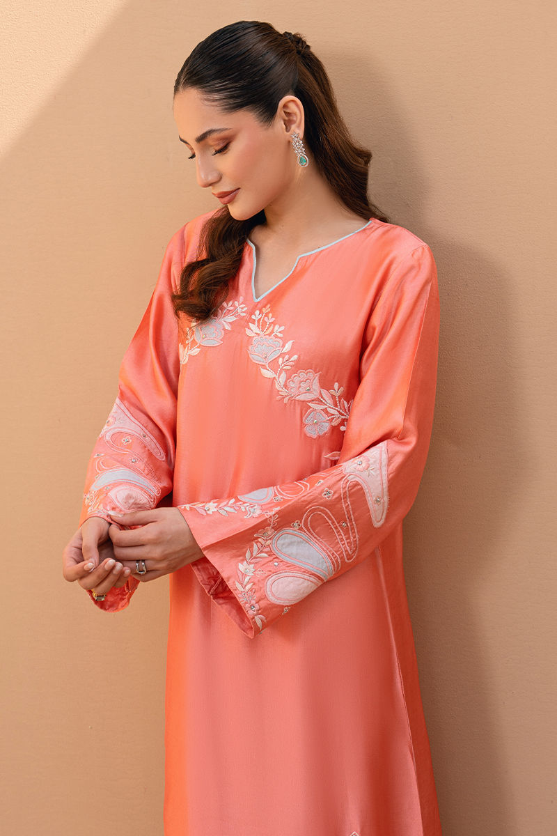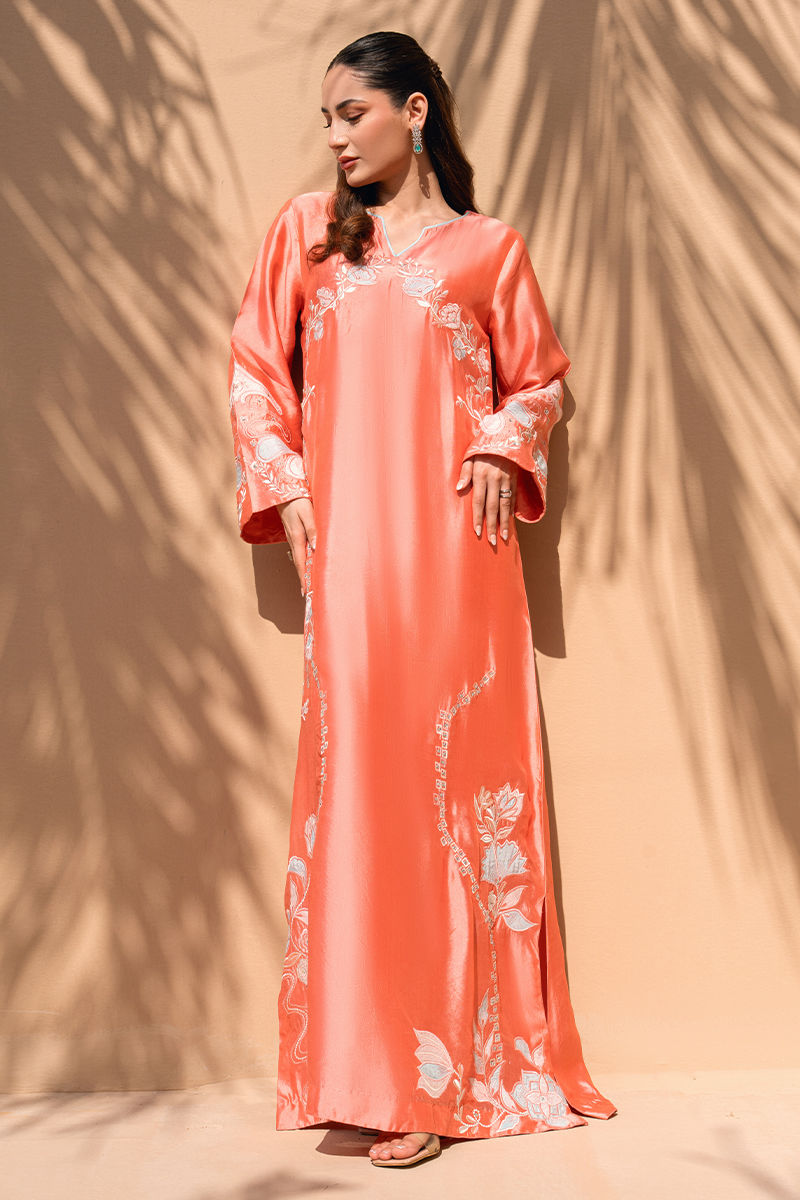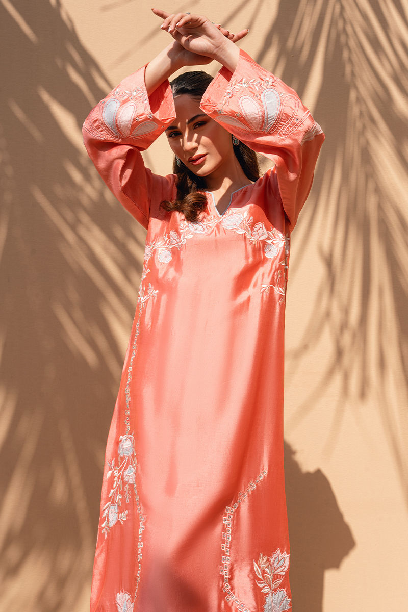 Radiating warmth and femininity, this coral-hued long silhouette is a graceful blend of ease and elegance. Crafted in a fluid fabric, the outfit features delicate ivory floral embroidery sweeping across the neckline, sleeves, and hem, creating a harmonious balance of detail and simplicity. The relaxed fall of the silhouette enhances movement, while the subtle craftsmanship lends a refined, timeless appeal. Ideal for daytime festivities, intimate gatherings, or festive brunches, this ensemble captures the essence of modern floral charm.