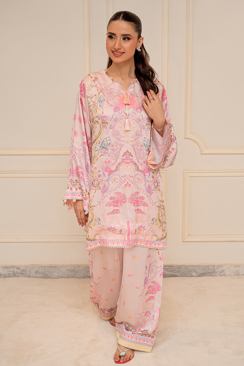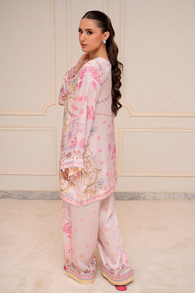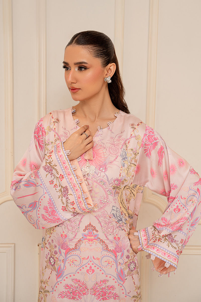 A modern take on florals, Blush Orchard features a soft pink base brought to life with intricate digital prints of trees and blooming florals. The front-open collared shirt, delicately finished with pearl detailing, adds a polished edge to the relaxed co-ord silhouette. Effortlessly chic and versatile, it transitions beautifully from daytime outings to intimate gatherings. Length: 33" to 35"
