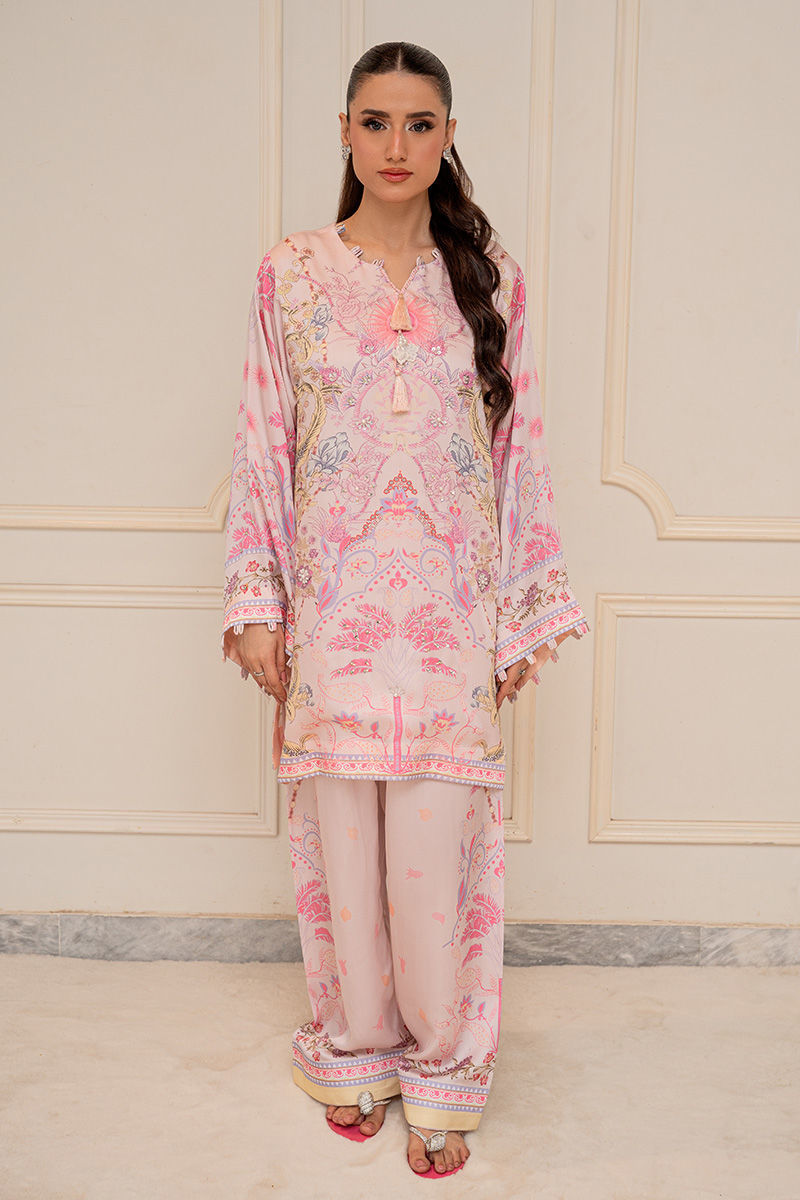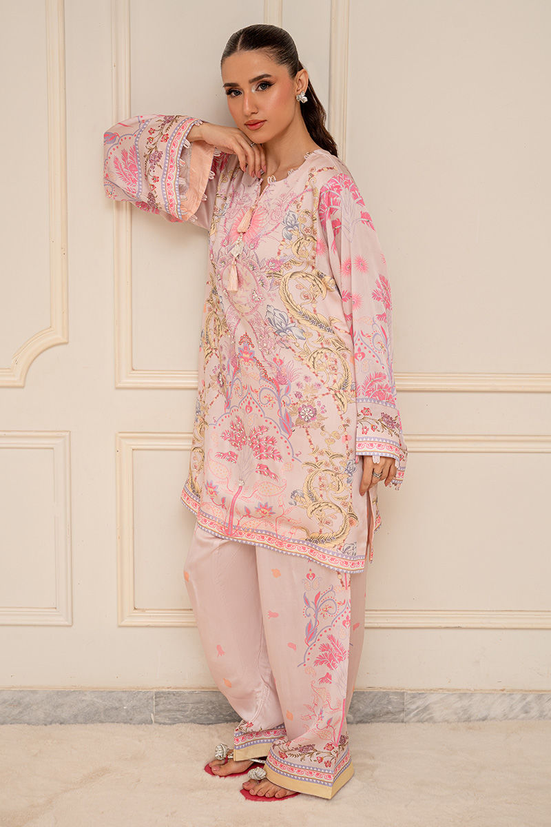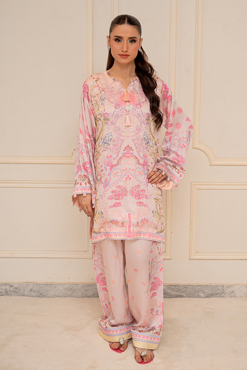 A modern take on florals, Blush Orchard features a soft pink base brought to life with intricate digital prints of trees and blooming florals. The front-open collared shirt, delicately finished with pearl detailing, adds a polished edge to the relaxed co-ord silhouette. Effortlessly chic and versatile, it transitions beautifully from daytime outings to intimate gatherings. Length: 33" to 35"