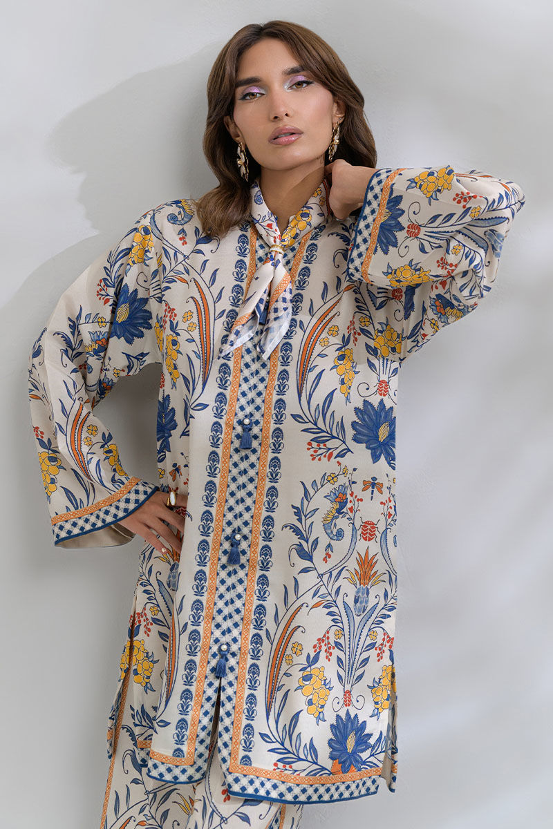 Brighten up your wardrobe with this vibrant two-piece swiss lawn co-ord set featuring a beige base and bold hues of royal blue, sunflower yellow, and hints of burnt orange. This is a straight-cut front-opened style short kurta adorned with blue tassels and is paired with matching trousers that echo the same print. This set offers effortless sophistication and ensures comfort and style for your casual gatherings, brunch dates, or daytime festivities