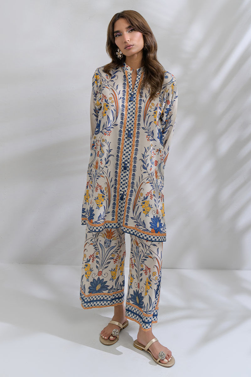 Brighten up your wardrobe with this vibrant two-piece swiss lawn co-ord set featuring a beige base and bold hues of royal blue, sunflower yellow, and hints of burnt orange. This is a straight-cut front-opened style short kurta adorned with blue tassels and is paired with matching trousers that echo the same print. This set offers effortless sophistication and ensures comfort and style for your casual gatherings, brunch dates, or daytime festivities