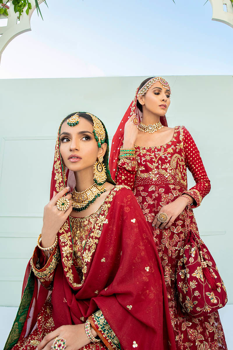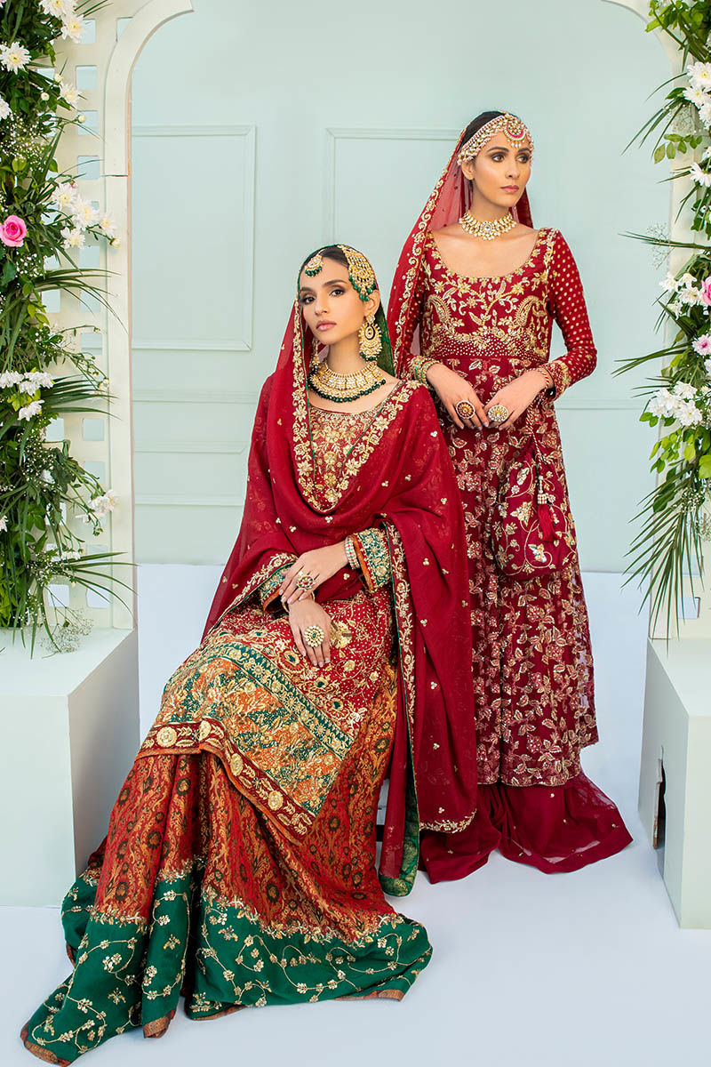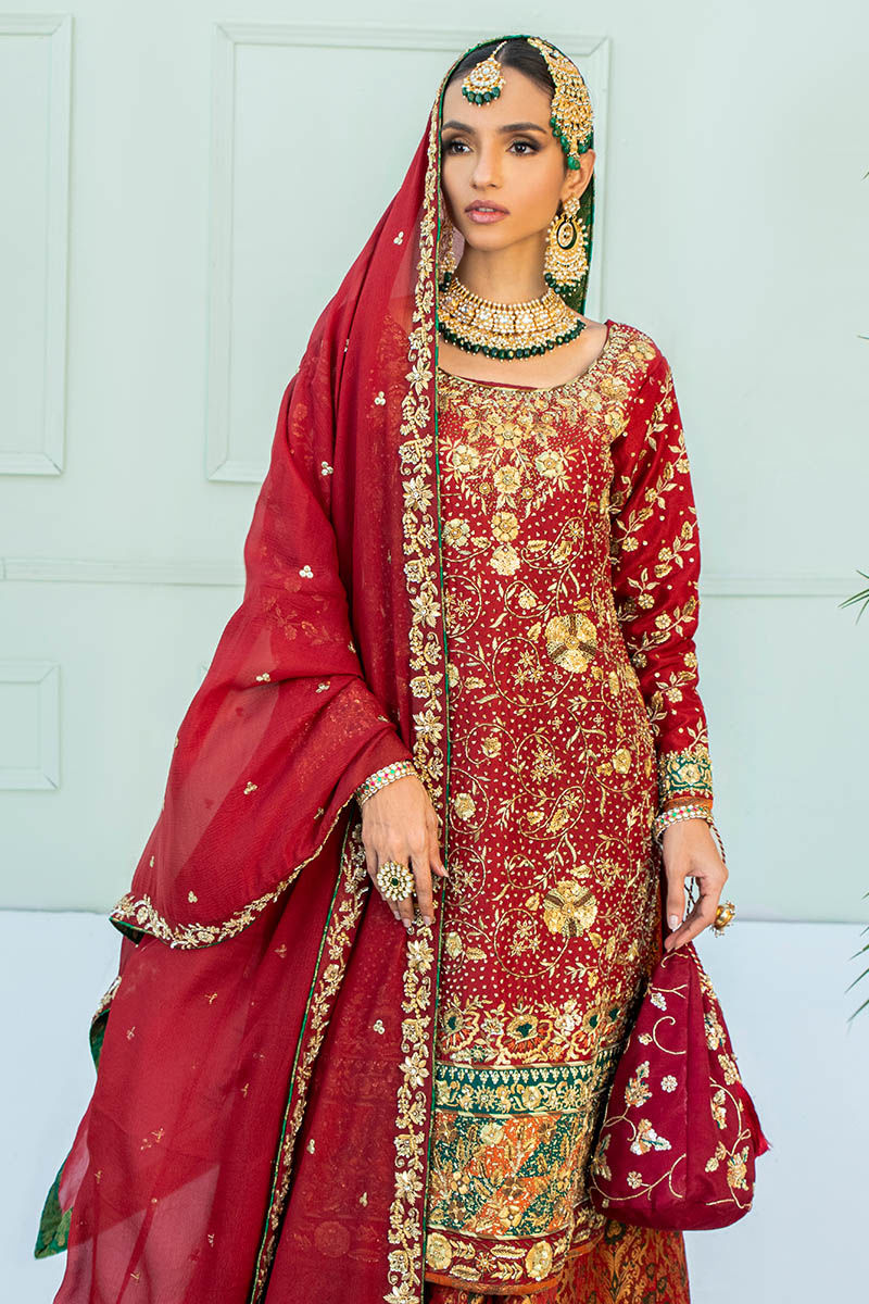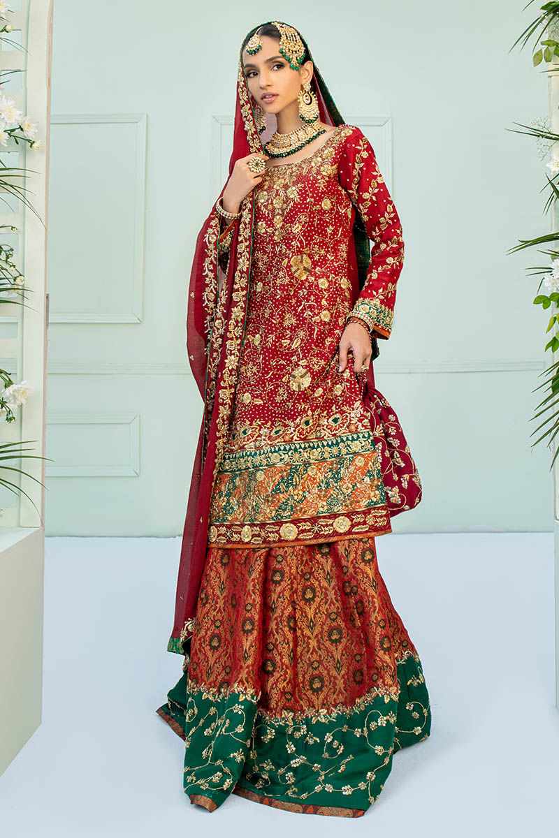 Gorgeous red bridal, all embellished with intricate details. Heavily embellished with zardozi, moti dana, tila,dabka, reesham and kora. With chatapatti embellished hemline, paired up with flair gharara. This traditional timeless silhouette is all what you need in for your wedding .