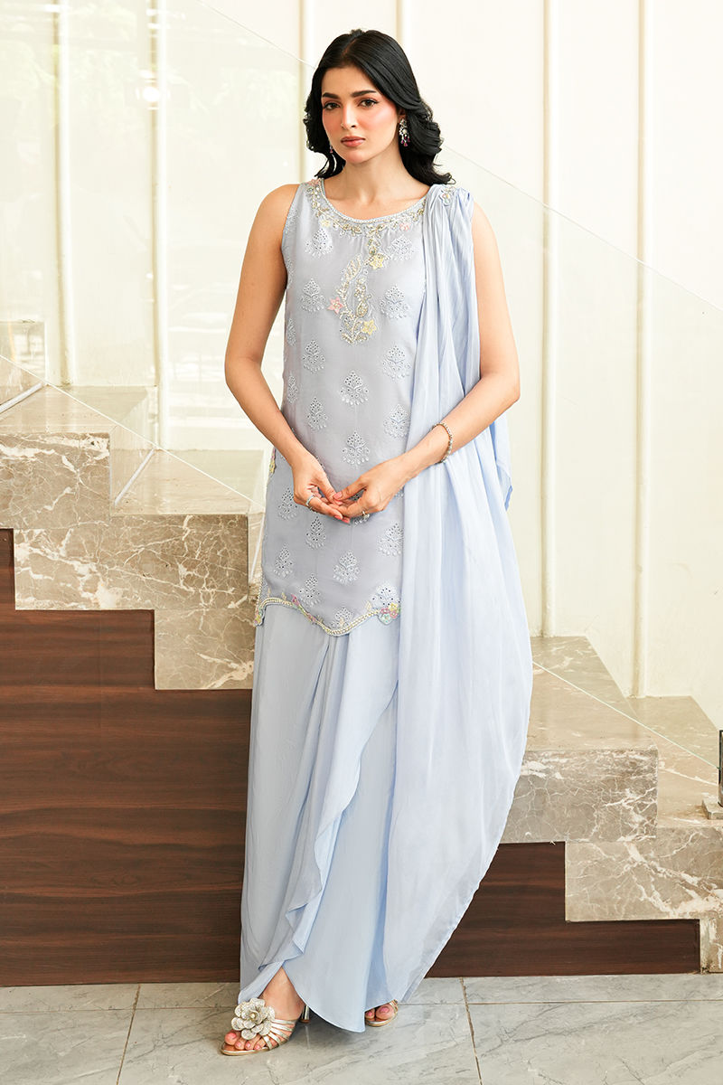 A striking indigo sleeveless short shirt, intricately adorned with cutwork embroidery and accented with pastel floral motifs, shimmering silver sequins, and hand-embellished stone detailing along the neckline. Paired with fluid skirt pants, the ensemble exudes contemporary sophistication, brought to life with a refined festive allure.