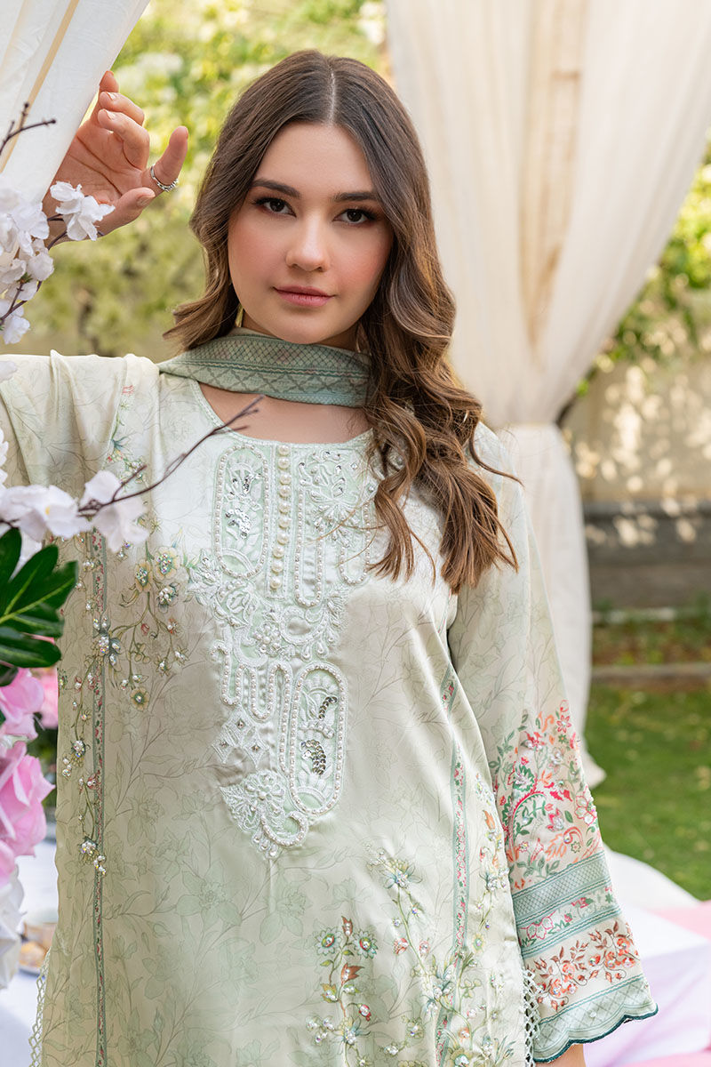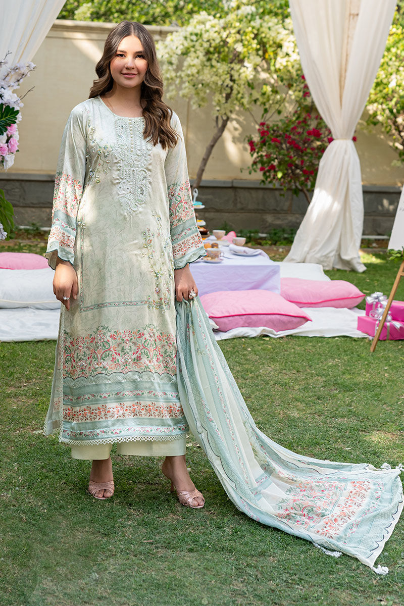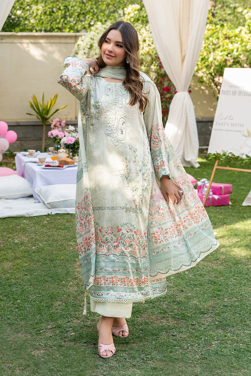 This gorgeous articles features a silk digital printed mint colored a-line shirt with floral motifs with a fully embellished neckline and panels all finished with cutwork borders and laces.