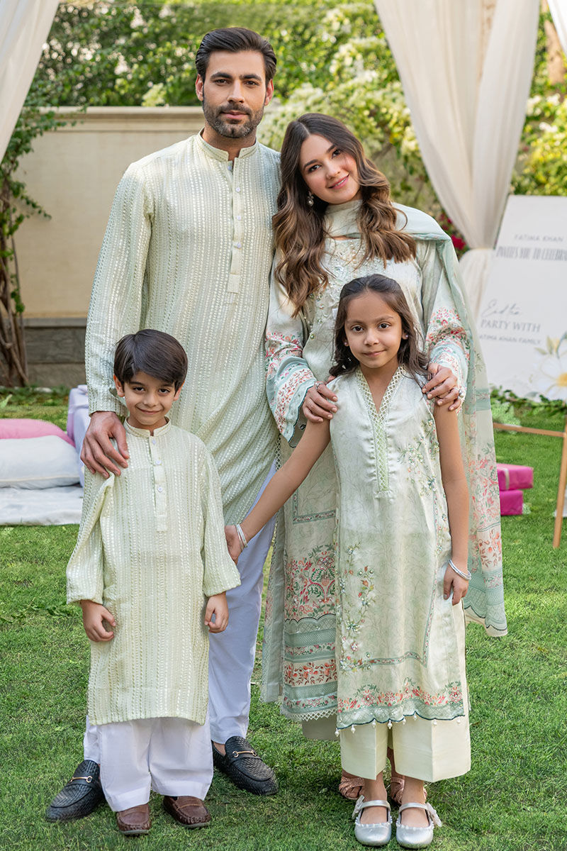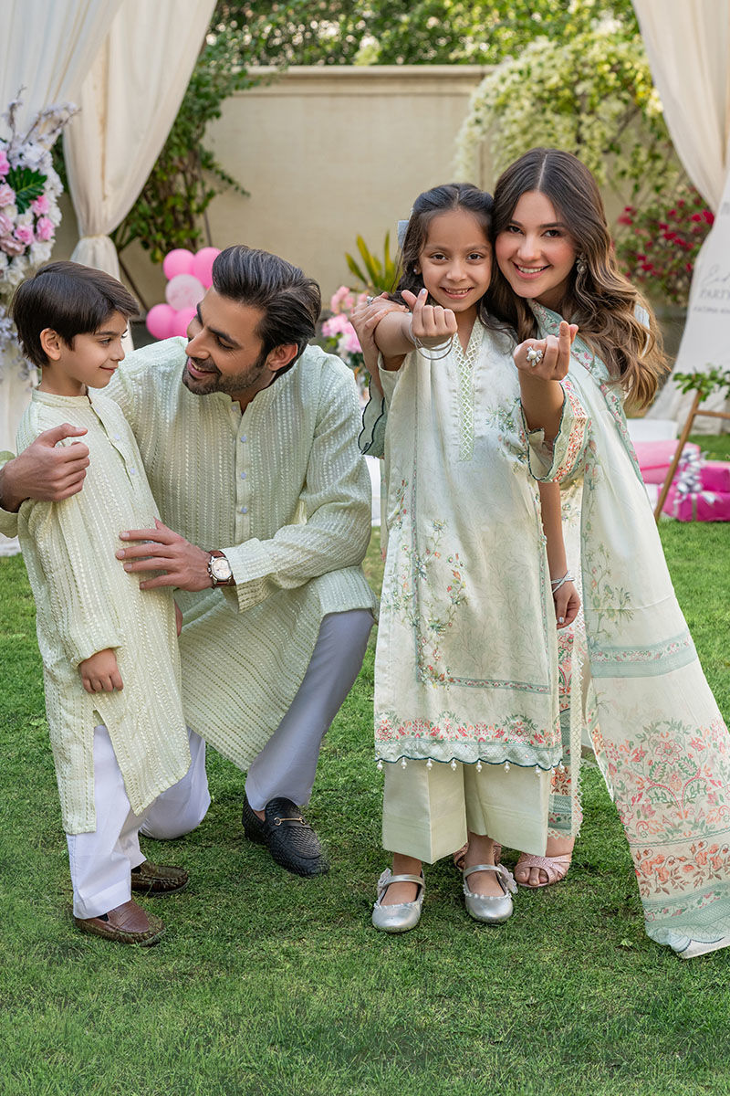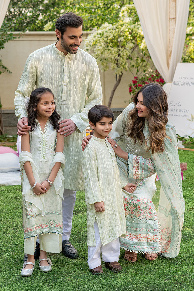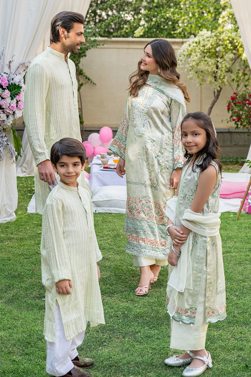 This gorgeous articles features a silk digital printed mint colored a-line shirt with floral motifs with a fully embellished neckline and panels all finished with cutwork borders and laces.