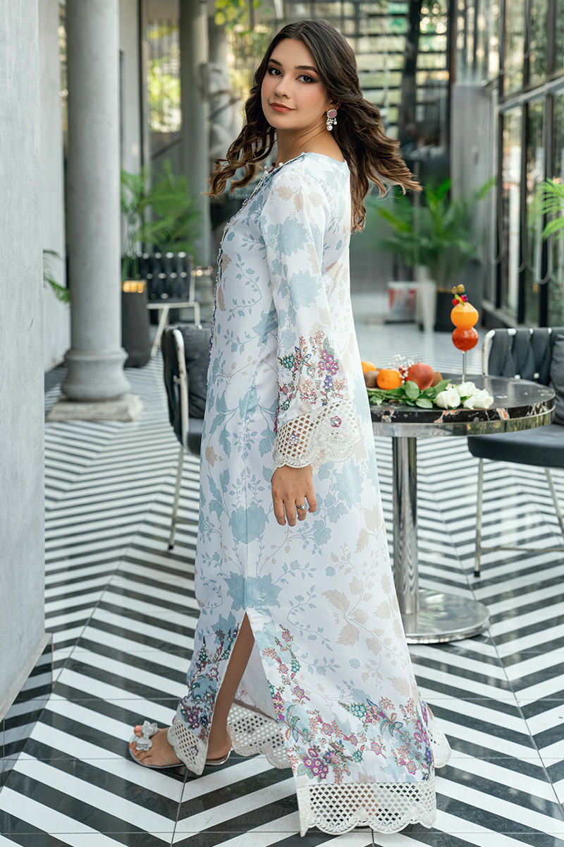This elegant kaftan is crafted on a soft ivory-white base, delicately adorned with a high-definition digital floral print in soothing tones of powder blue, soft aqua, muted teal, lavender, lilac, blush pink, and warm beige. The balanced color palette creates a fresh, airy, and refined look, perfect for graceful daytime wear.