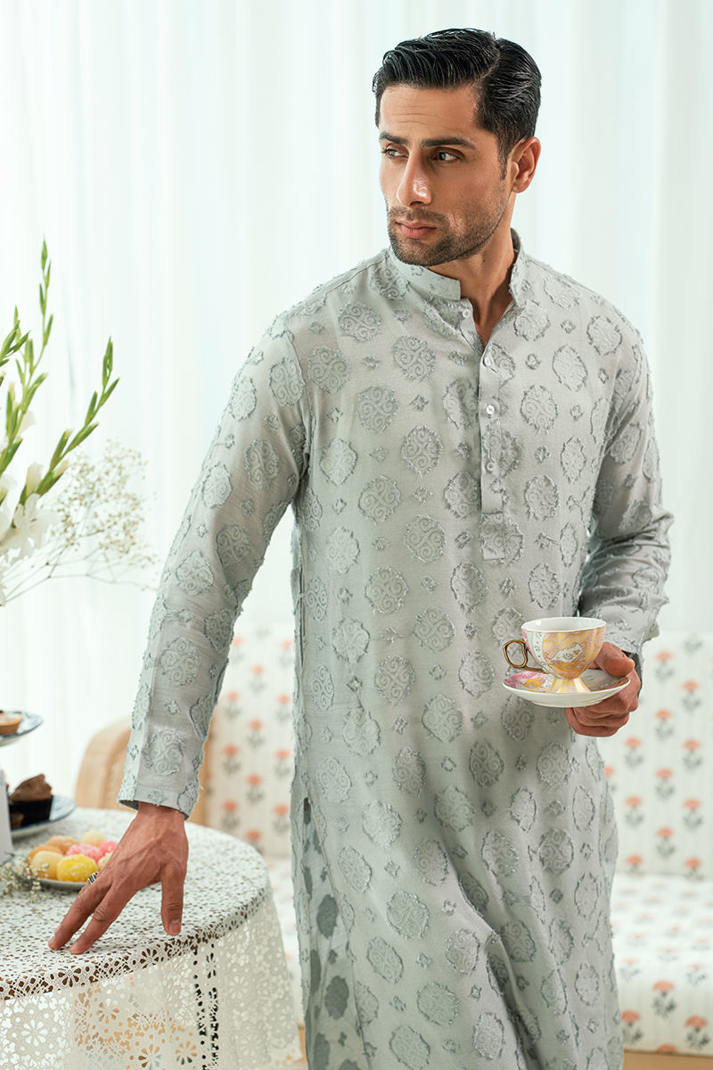 This grey kurta features an elegant jacquard weave that adds depth and quiet sophistication to the silhouette. Designed with a structured band collar and minimal detailing.