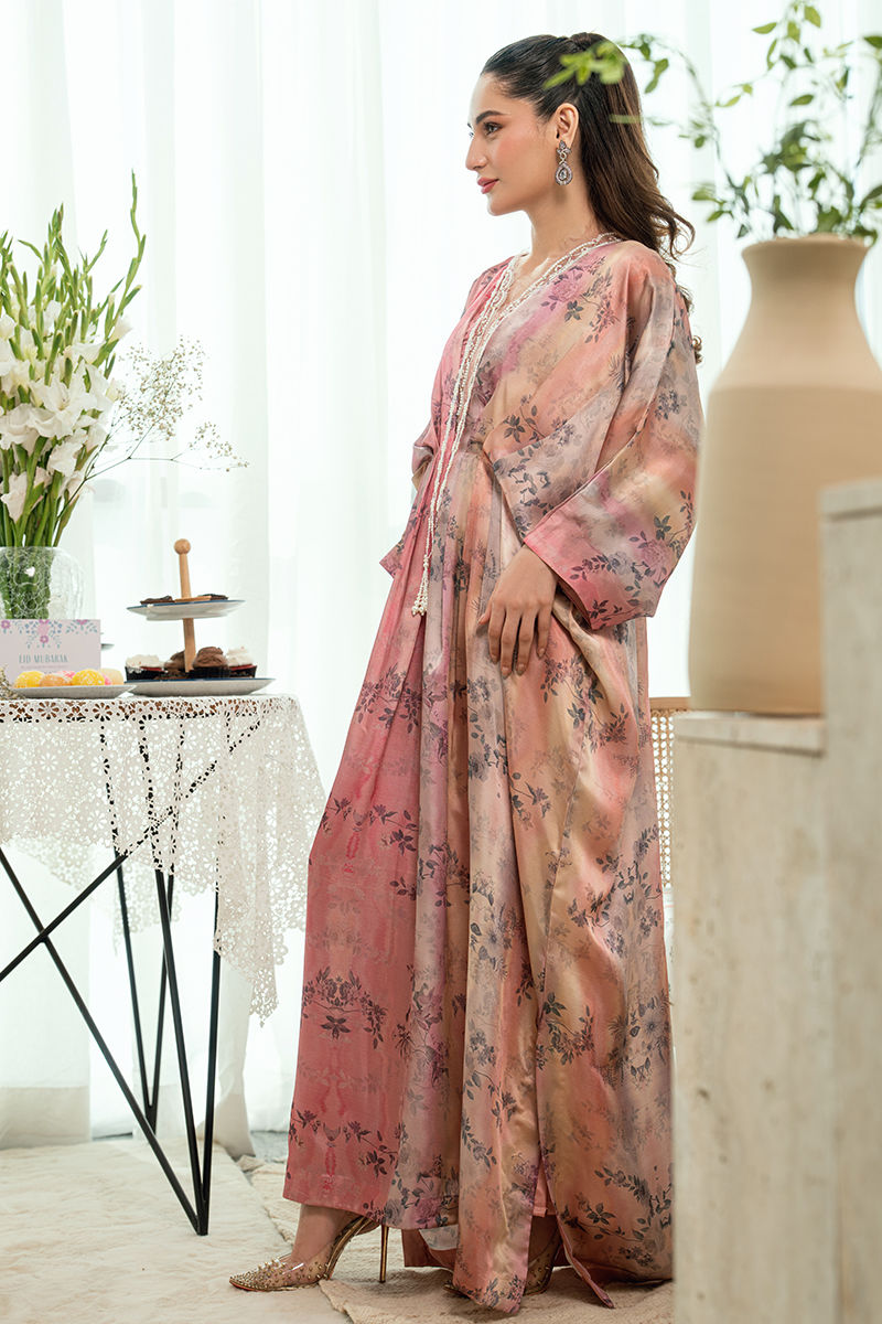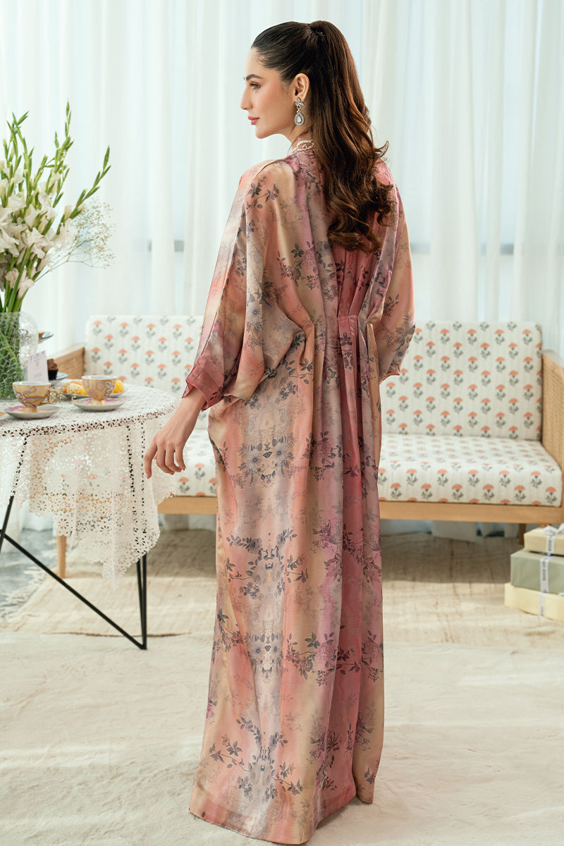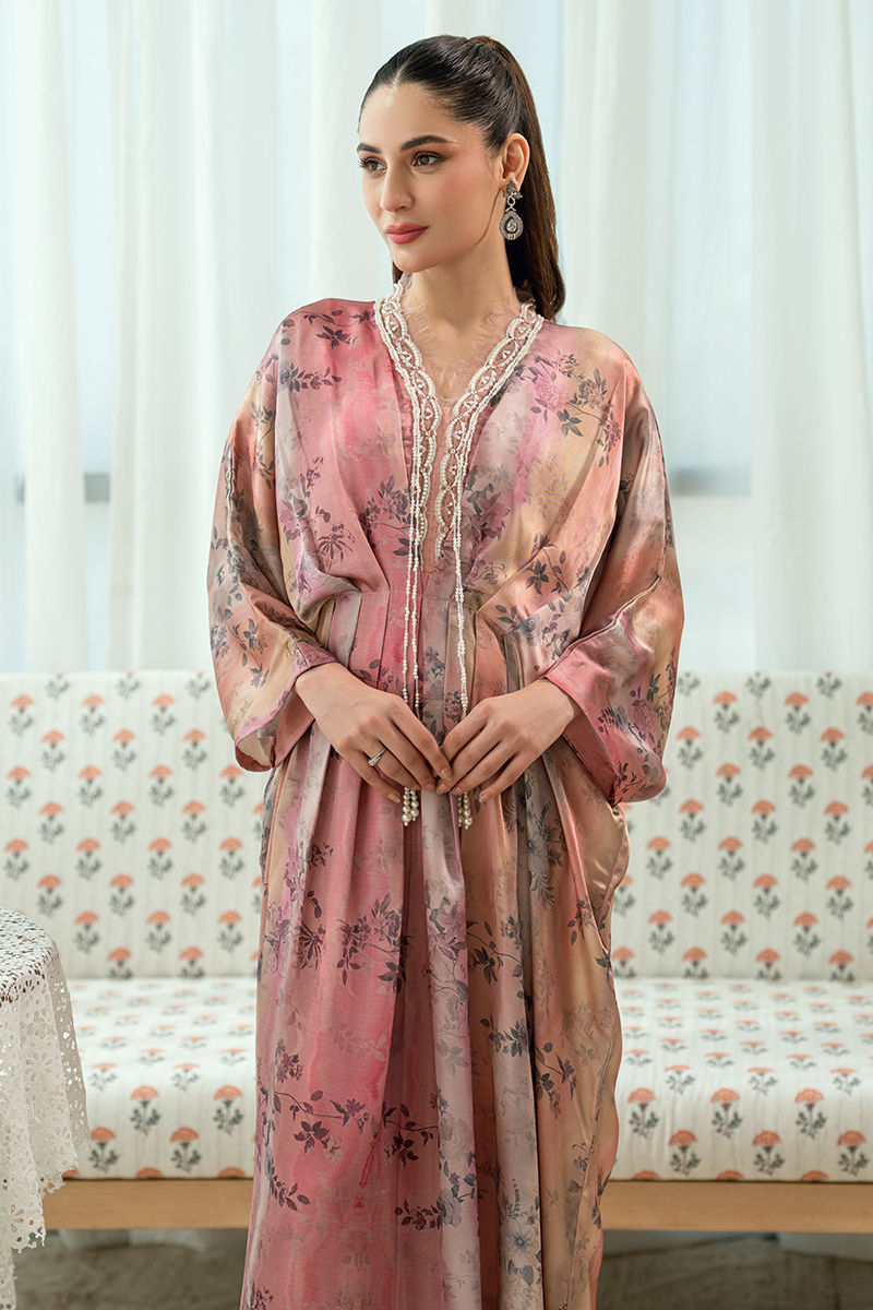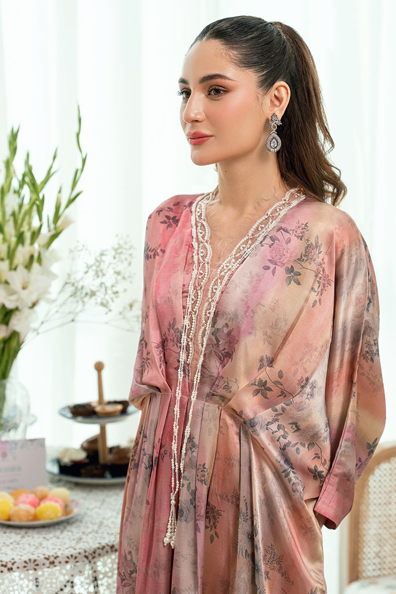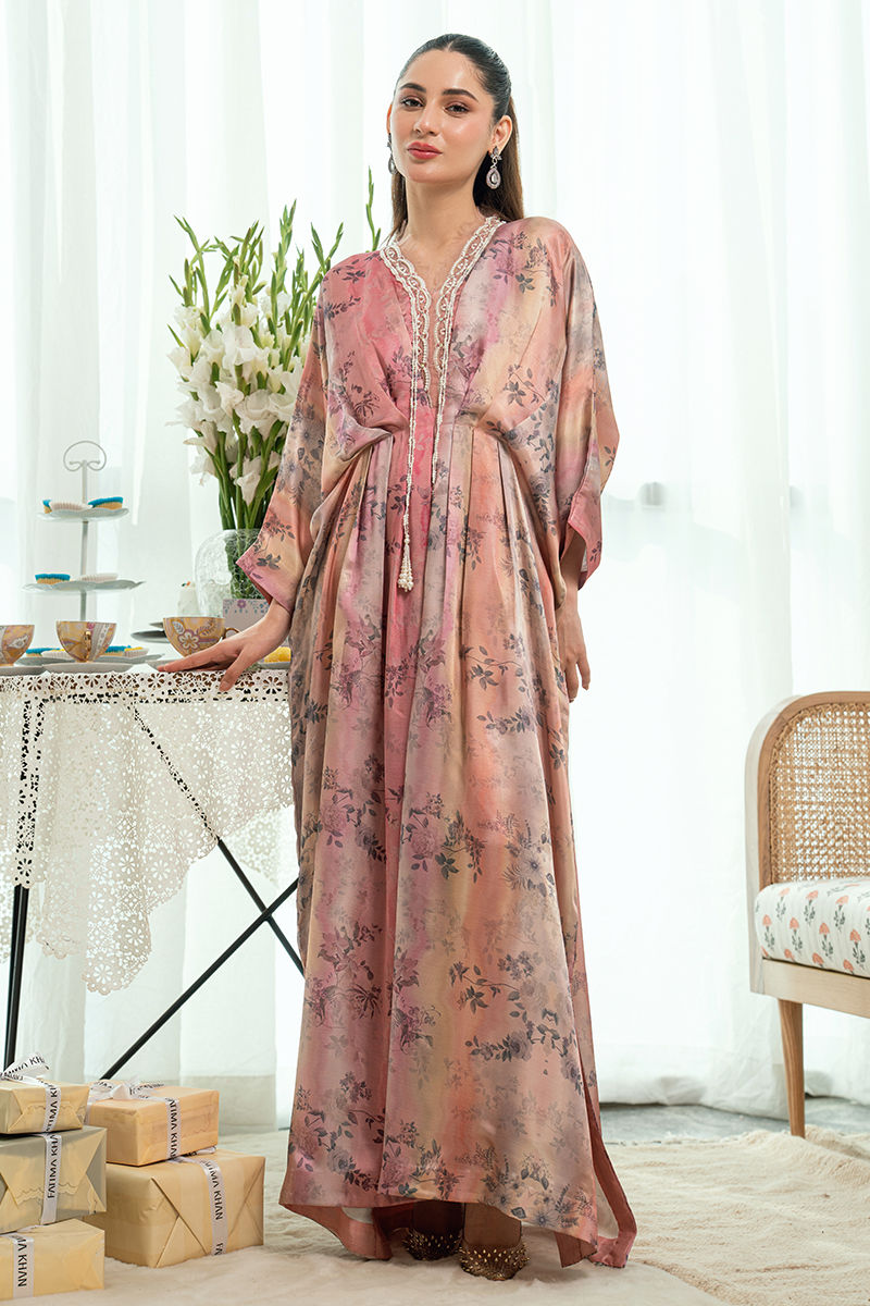 A romantic blush-toned kaftan adorned with soft floral prints, flows effortlessly with its gently cinched waist and graceful flare. The neckline is delicately finished with lace , embroidery and fine detailing, adding an old-world charm to the contemporary silhouette. Light, airy, and feminine, this piece is ideal for festive mornings and intimate celebrations.