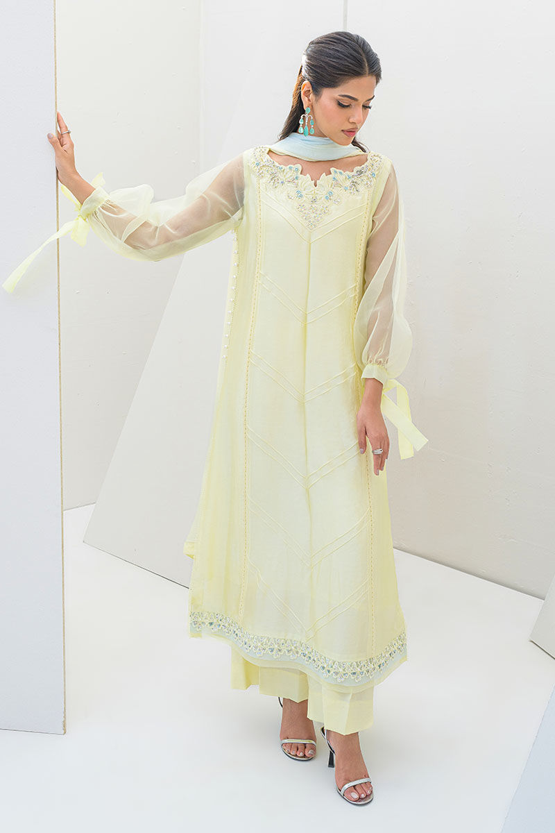 Bright and refreshing, Lemon Love features a lemon yellow A-line long shirt adorned with intricate pintuck detailing and a delicately embroidered cutwork neckline and daaman, accented with soft blue embellishments. Finished with organza trims and statement puffy sleeves tied with charming bows, the look is completed with matching cotton silk culotte pants and a dreamy ombré chiffon dupatta in shades of blue and yellow.