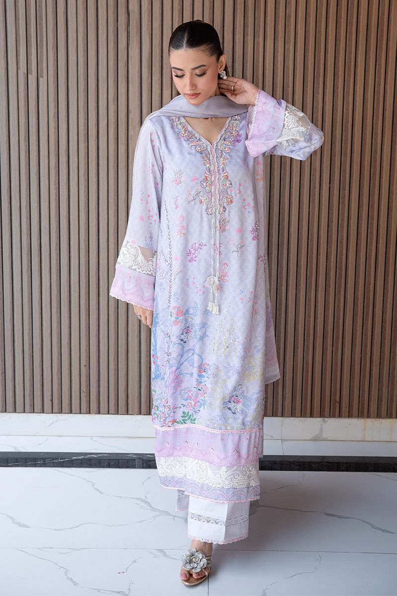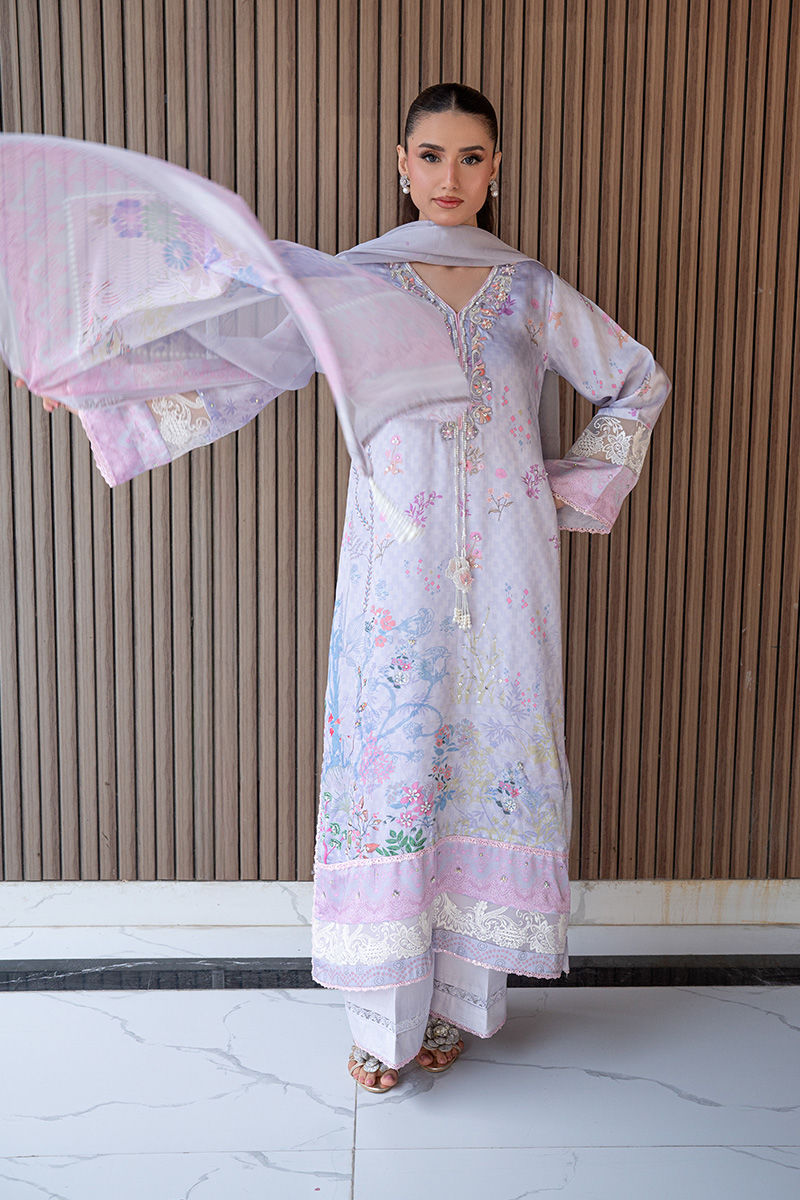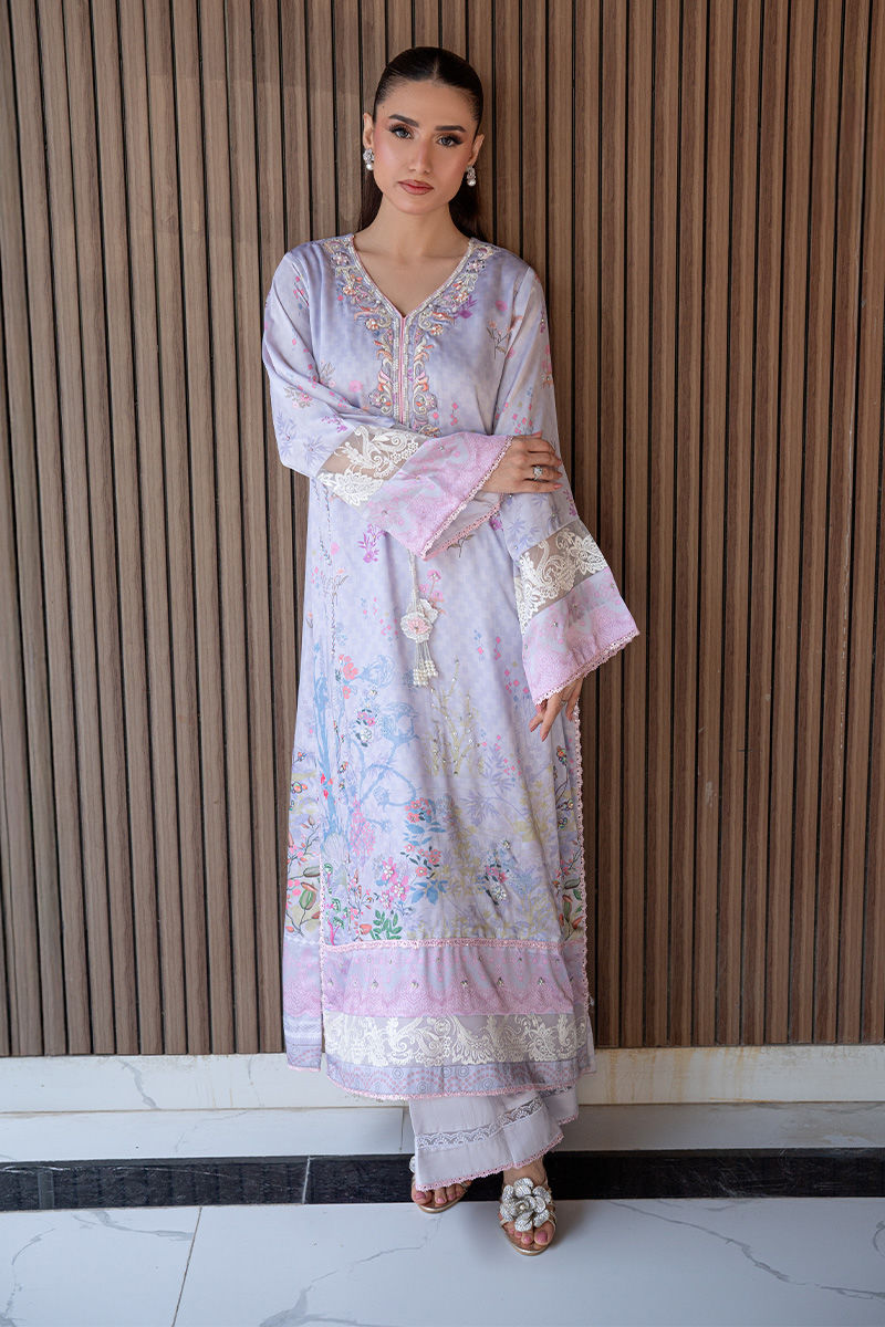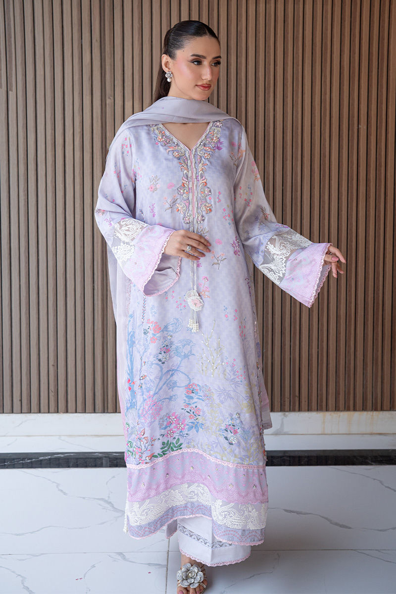 Ethereal and feminine, Liora unfolds in dreamy shades of lavender with intricately placed floral elements. The flowing silhouette, paired with a sheer dupatta, adds a sense of grace and lightness. Perfect for intimate occasions, this ensemble feels like poetry in motion—soft, romantic, and timeless. Length: 48" to 50"
