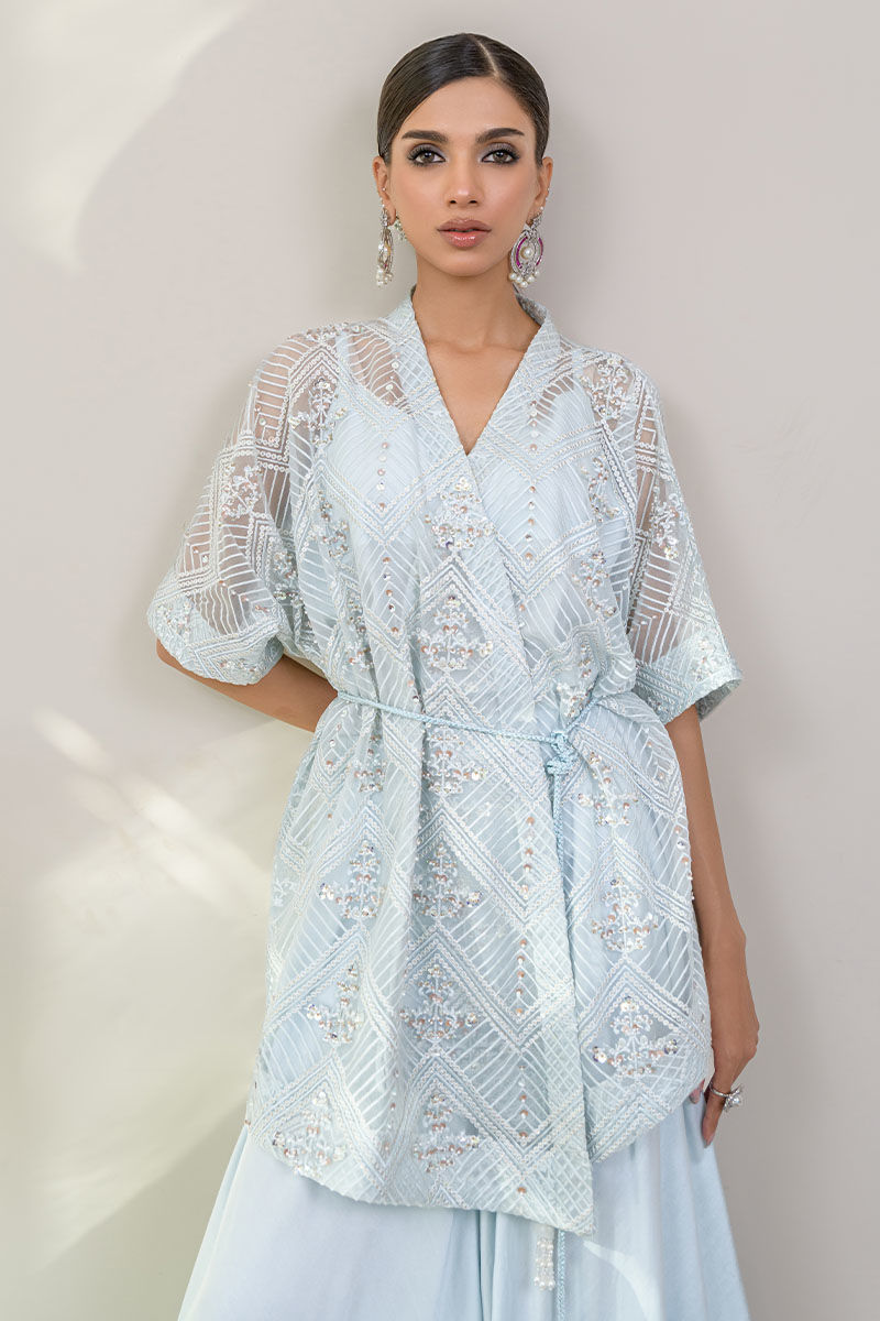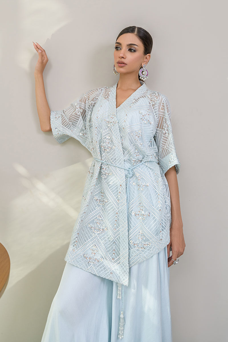The effortlessly chic ice blue ensemble guarantees you'll stand out wherever you go. Perfect for spring and summer, the pure organza short jacket features handmade embellishments, adding elegance and sophistication. Paired with loose, voluminous flared pants, this ensemble exudes timeless style and grace. Ideal for both special occasions and casual outings, it leaves a lasting impression with its refined charm.
