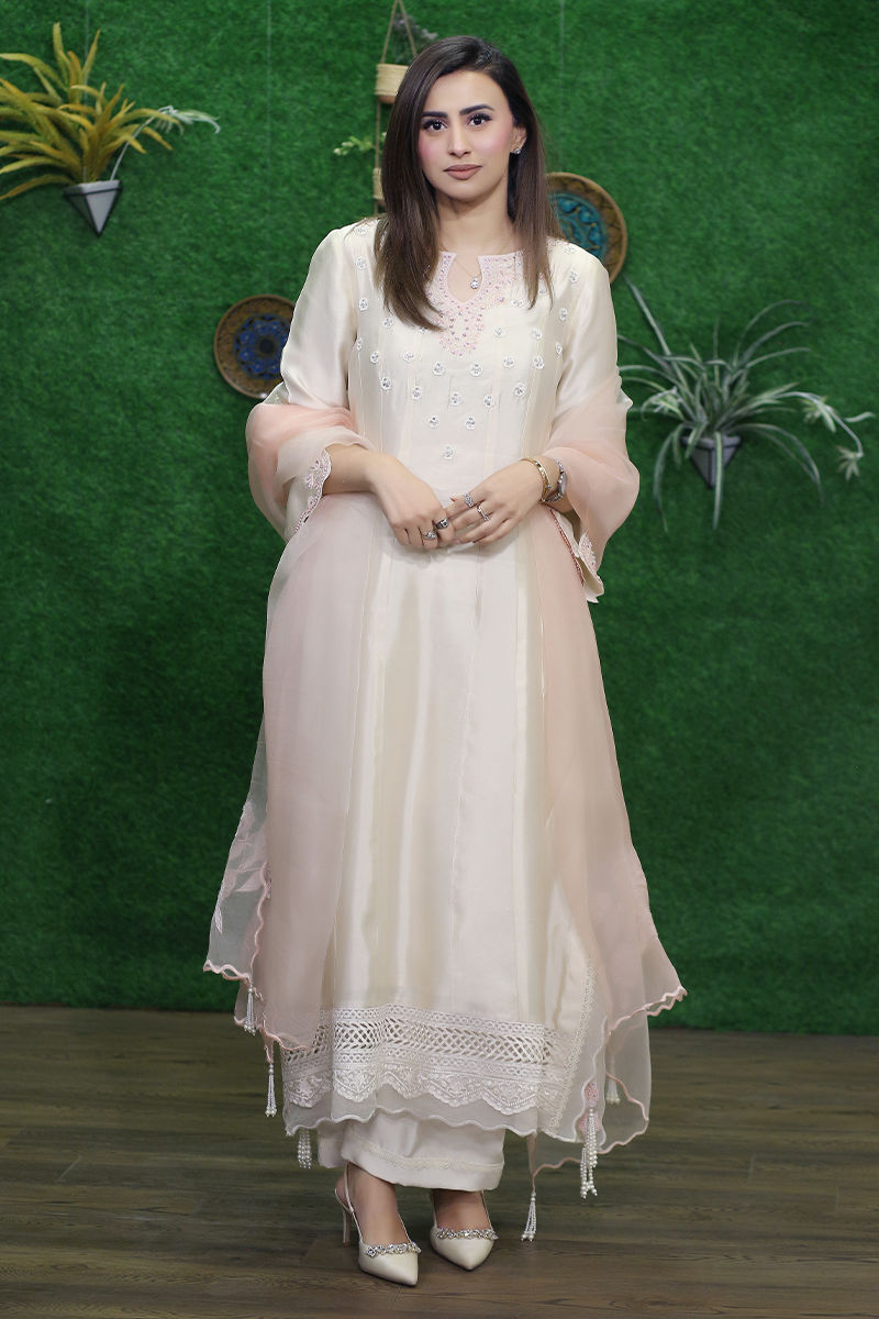 An ode to effortless grace, this ivory long silhouette exudes quiet femininity and refined charm. Crafted in a fluid, lightweight fabric, the outfit features delicate blush-toned thread embroidery scattered across the bodice, complemented by an intricately detailed neckline for a subtle yet elegant focal point. The sleeves are finished with fine embroidered accents, while the hemline is adorned with lace detailing that adds depth and texture to the flowing silhouette. Paired with a sheer blush dupatta, this ensemble is perfect for daytime festivities, garden gatherings, or intimate celebrations—where elegance speaks softly yet leaves a lasting impression.