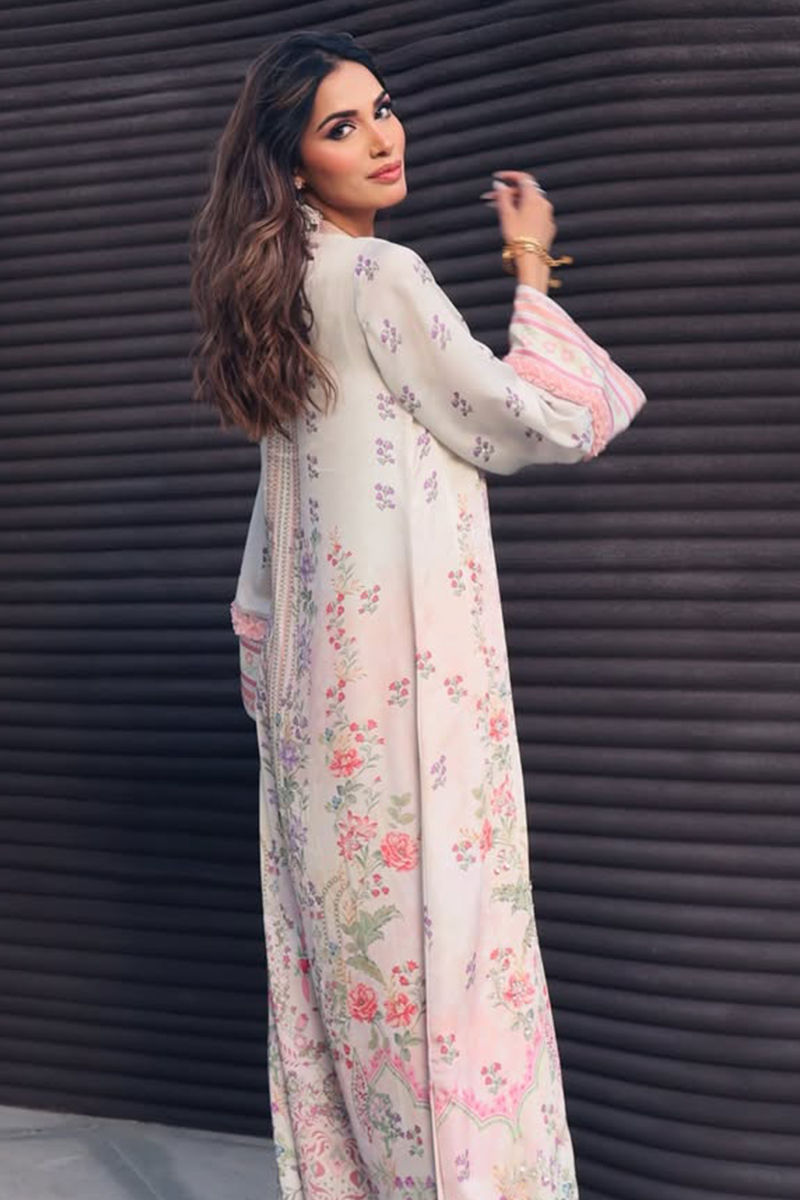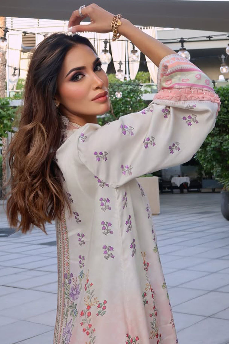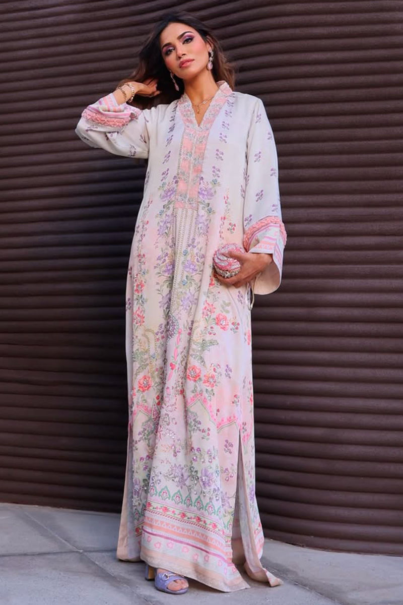 This elegant kaftan is crafted in a soft ivory-cream base, adorned with a refined digital floral print in delicate hues of lavender, blush pink, soft peach, and muted green. The silhouette is fluid and graceful, designed to drape effortlessly while maintaining a polished, elongated look. The focal point of the design is the finely embroidered neckline, enhanced with subtle embellishments that add a gentle shimmer and artisanal depth without overpowering the print. The rest of the kaftan remains intentionally clean, allowing the intricate digital motifs and pastel color story to take center stage. Finished with printed borders at the hem and sleeves, the piece reflects understated sophistication. Perfect for festive daywear, elegant lunches, and refined semi-formal occasions, this kaftan embodies effortless luxury and timeless femininity. Product Highlights • Kaftan silhouette with fluid, relaxed drape • High-definition digital floral print • Color palette: ivory base with lavender, blush, peach, and soft green accents • Embroidered and lightly embellished neckline • Clean body design for balanced elegance • Printed borders at hem and sleeves • Comfortable, breathable, and graceful A thoughtfully designed kaftan for women who appreciate soft prints, delicate craftsmanship, and quiet luxury. . kaftan Length 52 to 53 inches