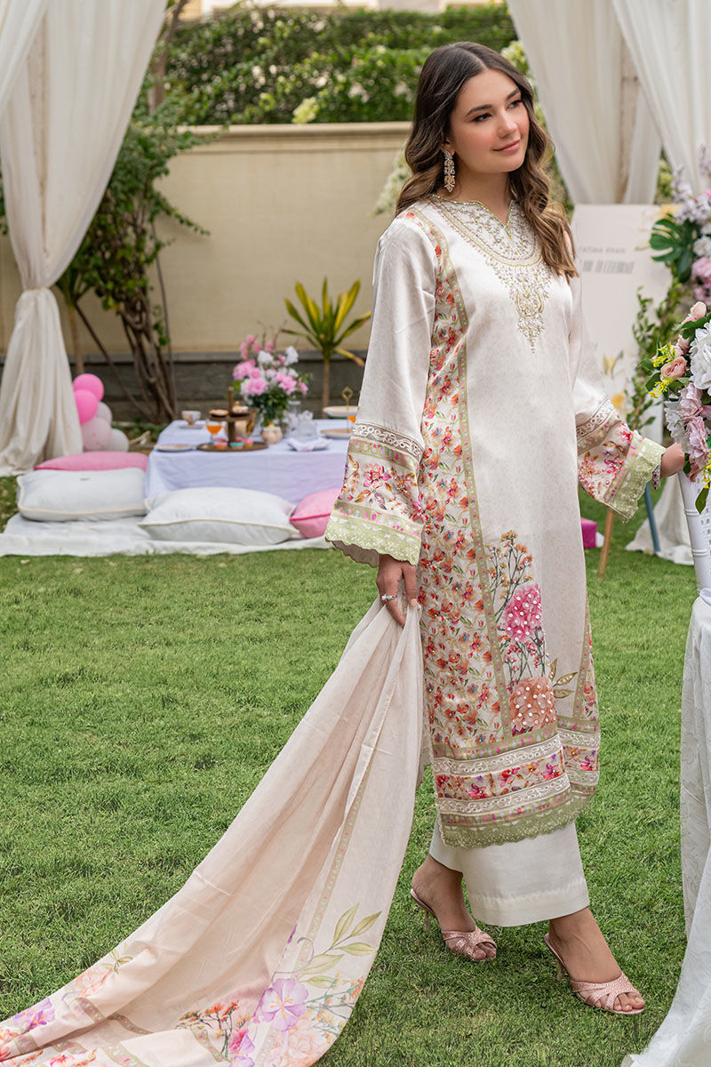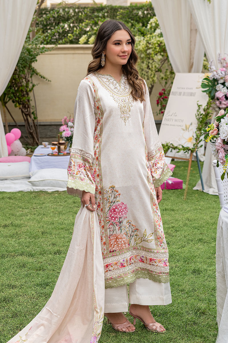 This gorgeous articles features a silk digital printed ivory a-line shirt with floral motifs with a fully embellished neckline, daaman and side panels all finished with cutwork borders and paired with an ivory culotte pant and a similarly printed medium silk dupatta with heavy tassels