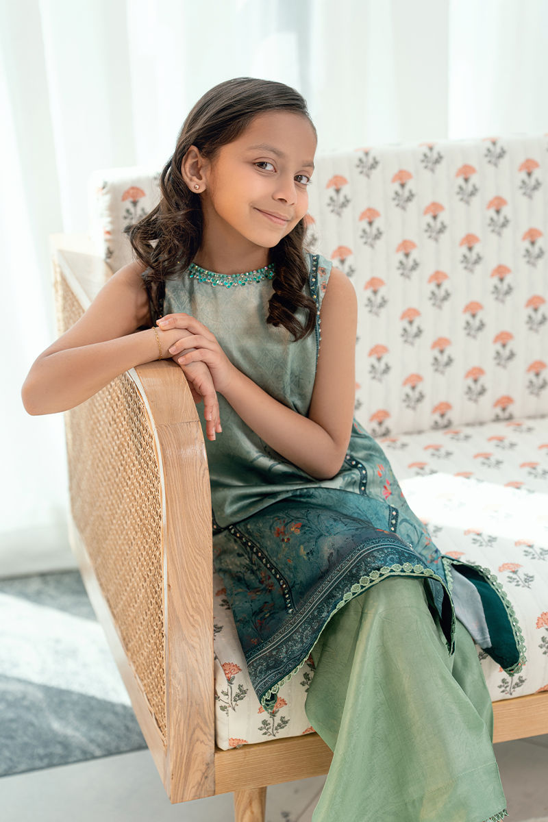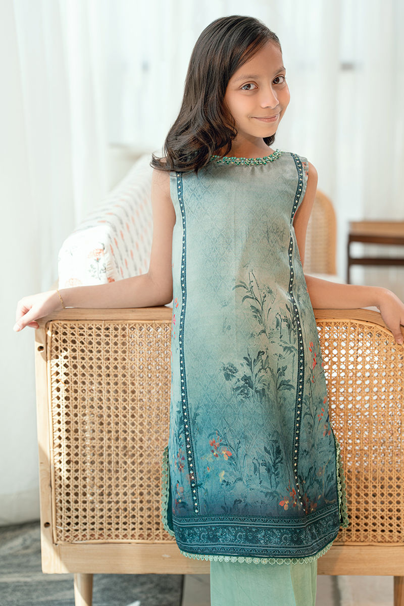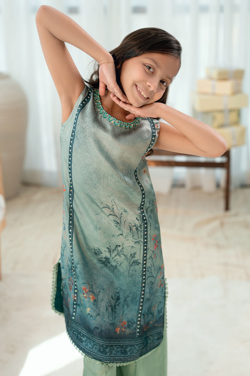 Rendered in a rich teal hue, Aabroo features a beautifully printed kurta with delicate botanical motifs and finely embroidered detailing along the neckline and borders. The relaxed silhouette is balanced with subtle craftsmanship, making it both wearable and refined. Paired with culottes pants in a complementary tone, this ensemble is perfect for women who appreciate elegance with ease.