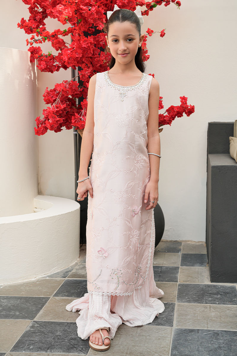 A romantic blush pink mommy and me ensemble, delicately draped and adorned with intricate embellishments and fine embroidery. The fluid silhouette creates a soft, ethereal presence bringing together timeless femininity with a refined, modern festive allure.
