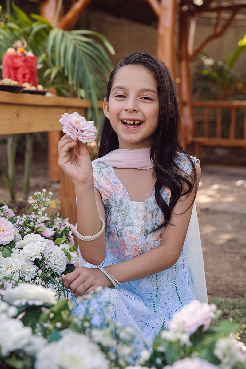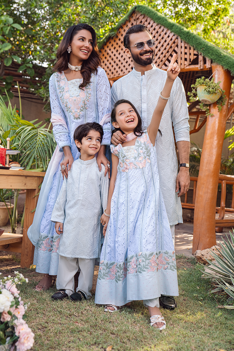 Embark on a journey of elegance and charm with our Chikan ensemble in refreshing ice blue and pink hues. The colored embroidered borders and blockprinted details infuse depth and character, transforming it into a dreamy world where every detail narrates a story of beauty and sophistication.