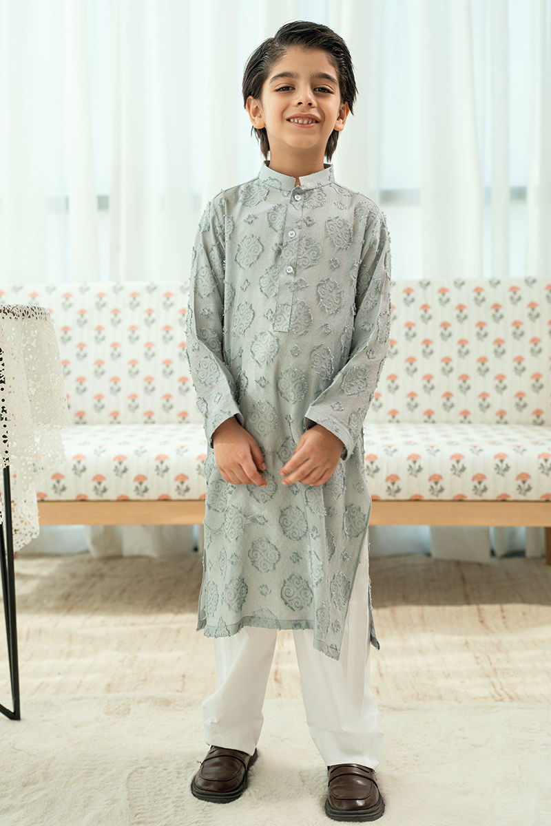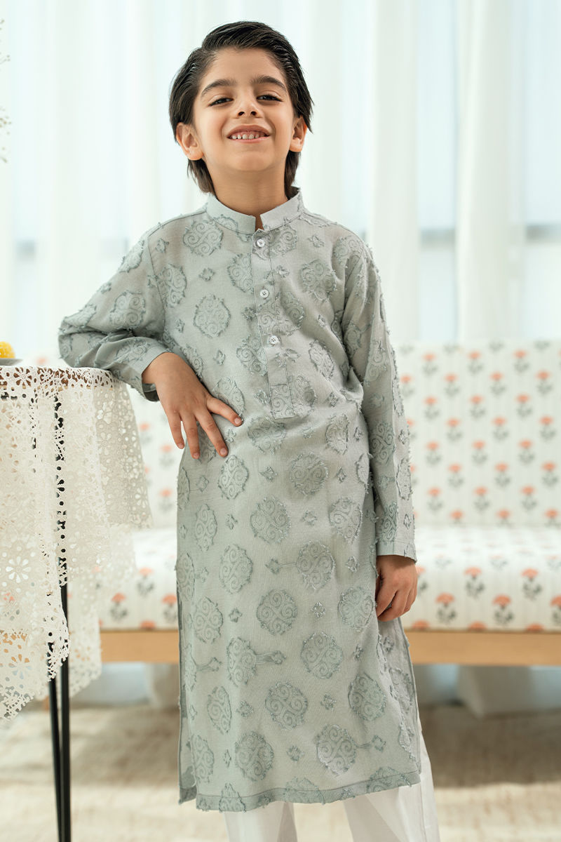 This grey kurta features an elegant jacquard weave that adds depth and quiet sophistication to the silhouette. Designed with a structured band collar and minimal detailing.