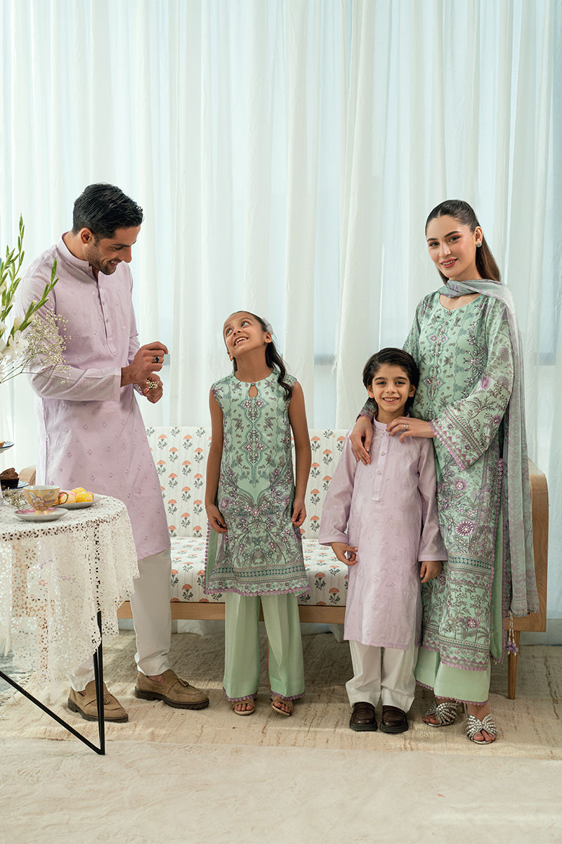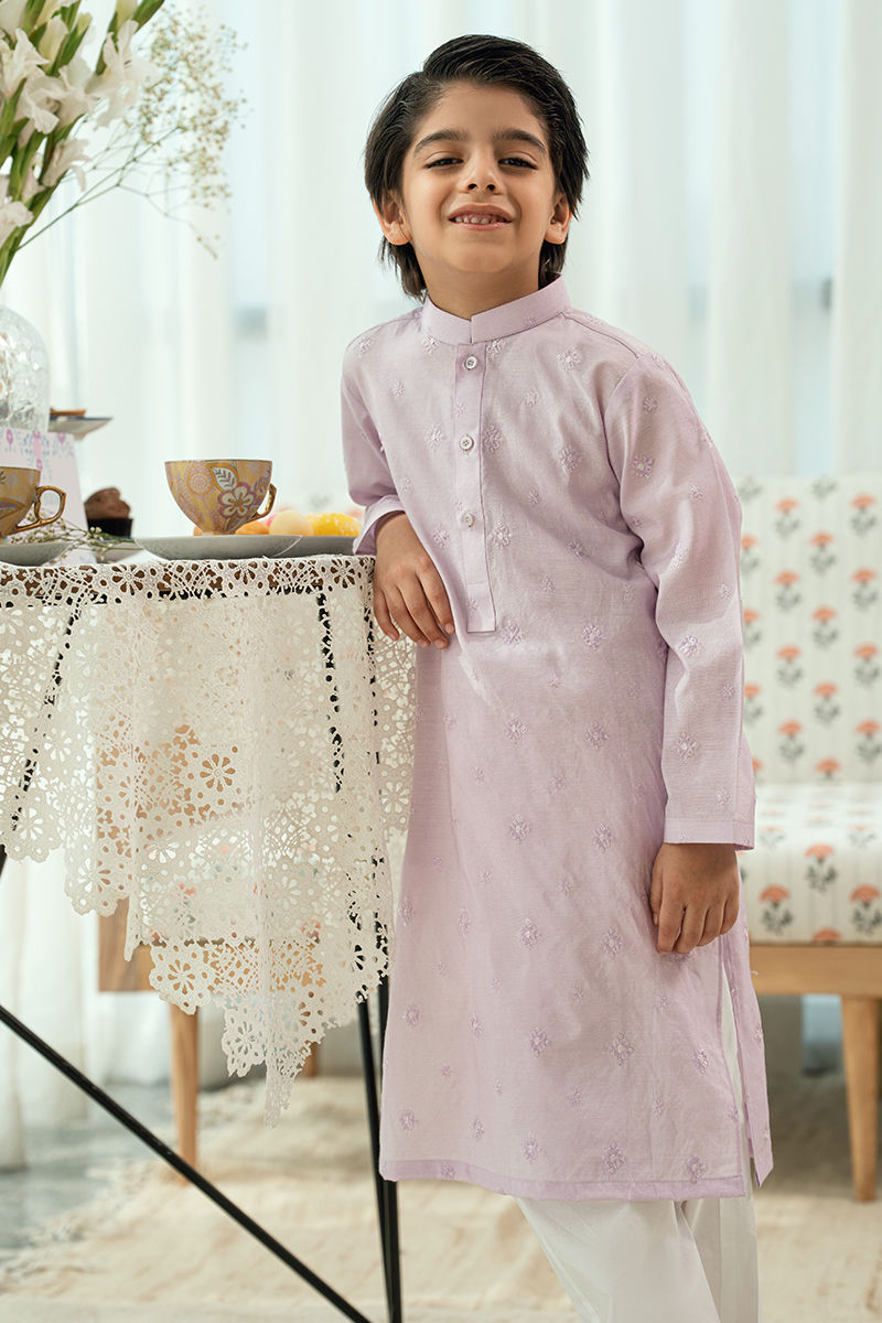 A refined lilac kurta crafted on a soft, breathable base, detailed with subtle self-textured embroidery across the surface. The classic band collar and clean placket lend a timeless appeal, while the tailored yet relaxed fit ensures all-day comfort. Paired with crisp white shalwar, this kurta is perfect for Eid, festive gatherings, and elegant daytime occasions.