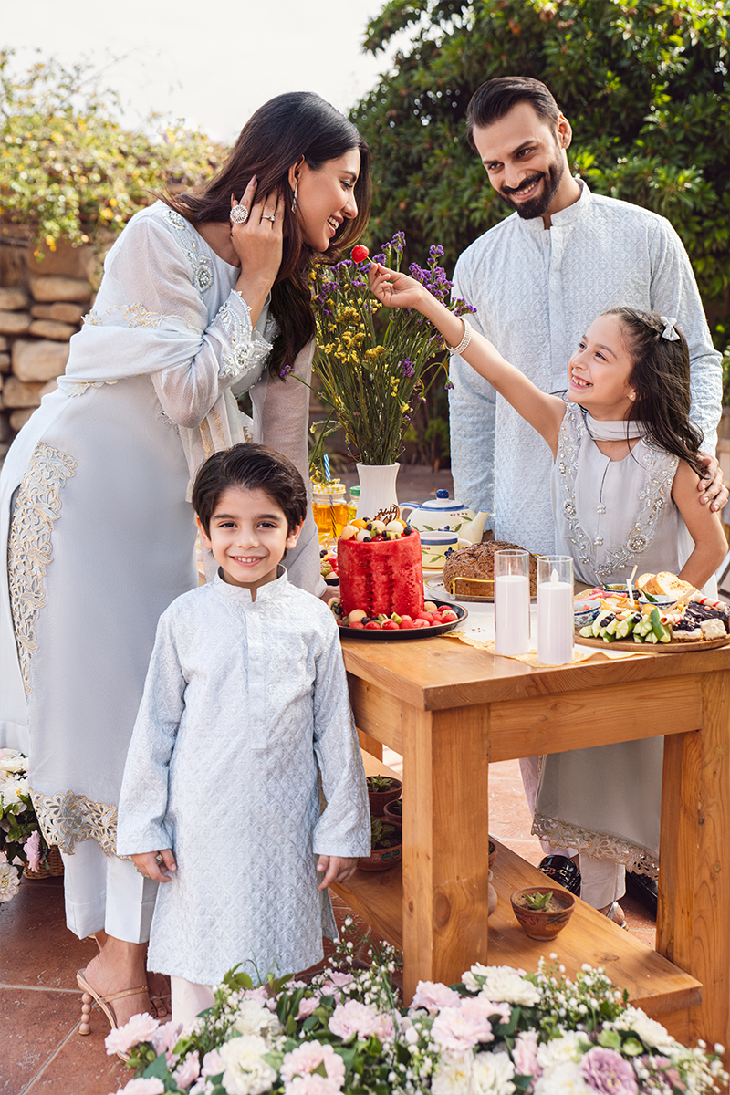 The grey shirt, adorned with delicate applique, cutwork, and pearl detailing in light grey and gold tones, is truly exquisite. Crafted from luxurious khadi silk with intricate reesham work, it radiates luxury.