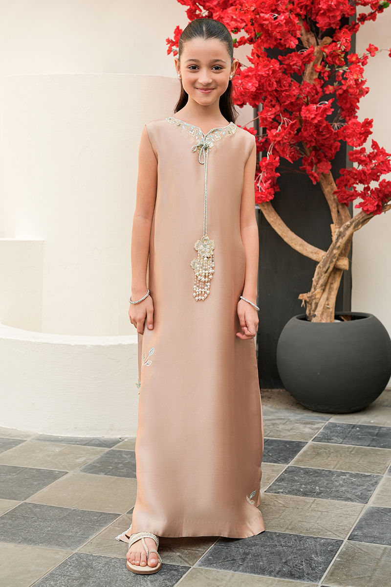 A graceful champagne-toned mommy and me kaftan, crafted in lustrous silk and adorned with delicate floral embroidery. Elevated with statement tassel accents and intricate detailing along the sleeves and hem, the flowing silhouette exudes effortless elegance, perfect for festive gatherings and intimate celebrations.