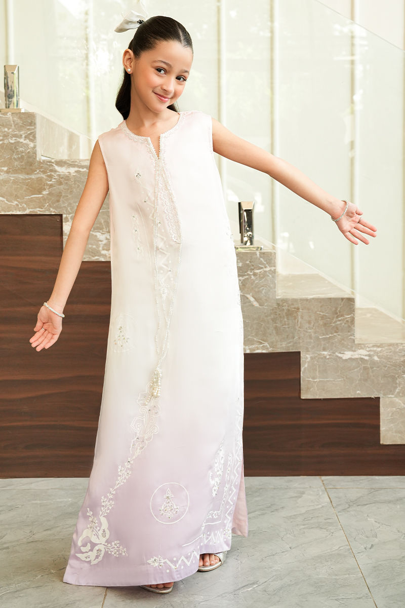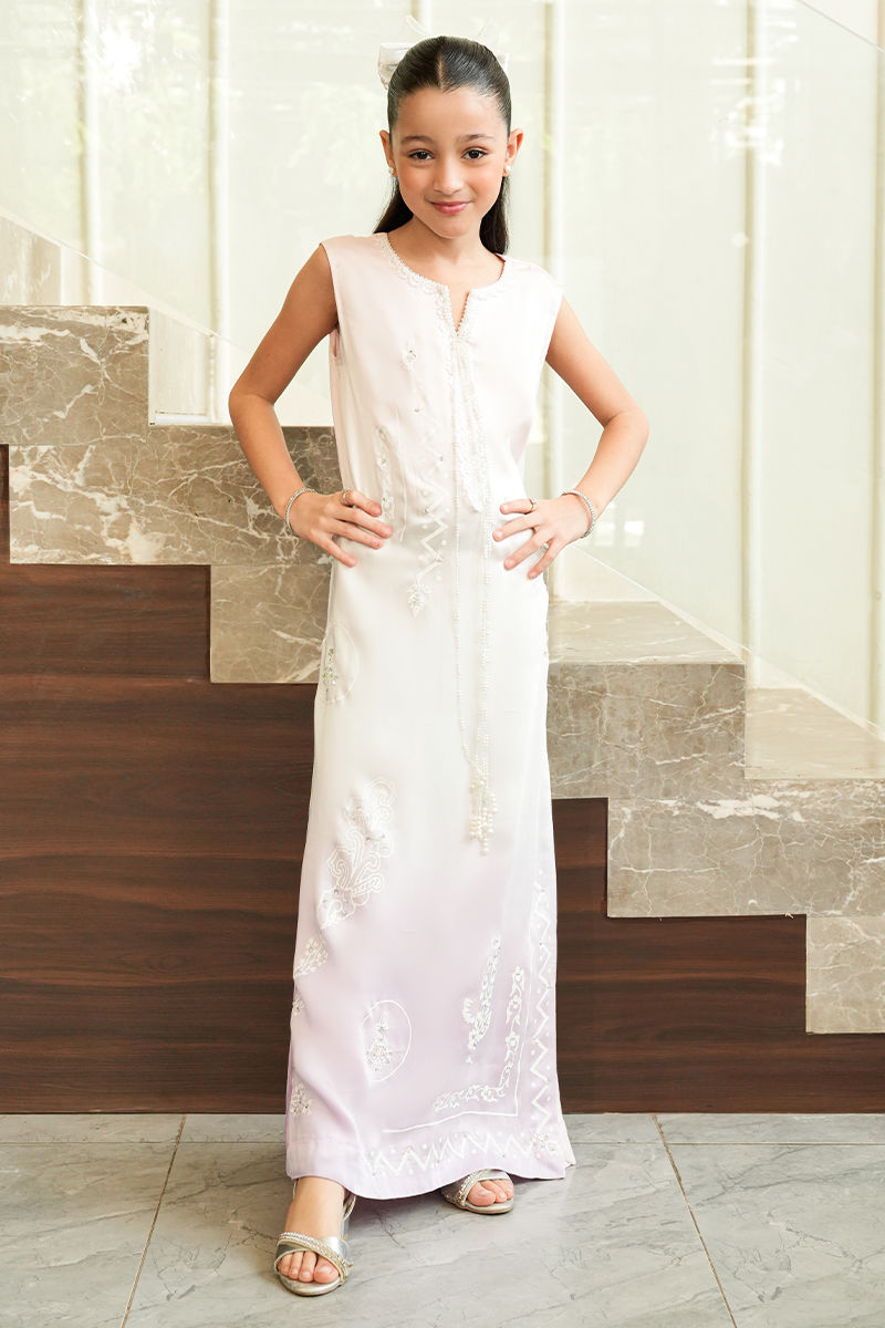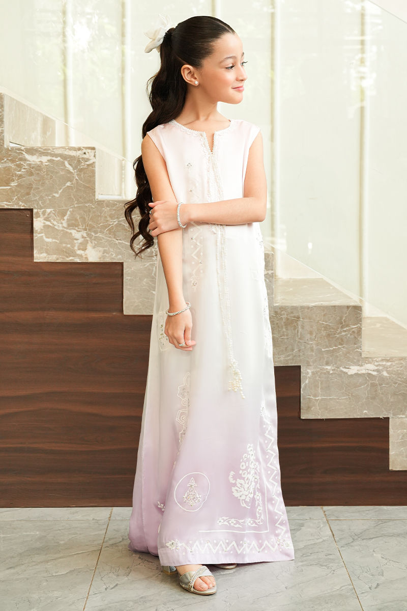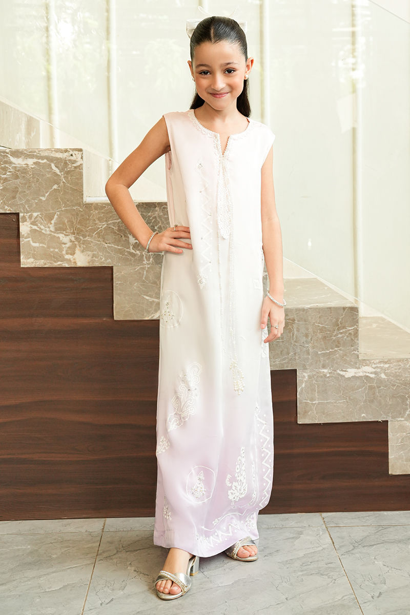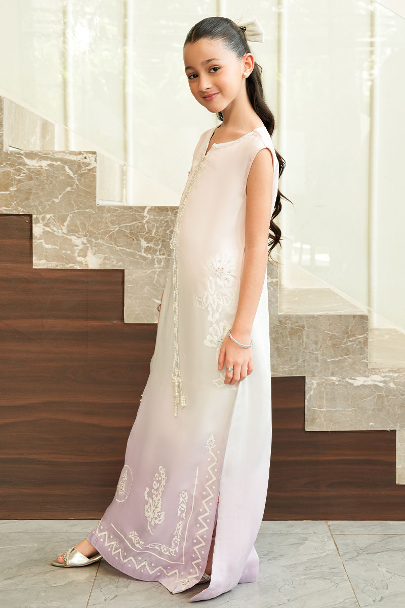 An elegant ombré-shaded silk kaftan, adorned with intricate block print detailing and a finely embroidered neckline. Elevated with delicate pearl hangings, the silhouette flows with effortless ease capturing a refined balance of artisanal craftsmanship and contemporary sophistication.