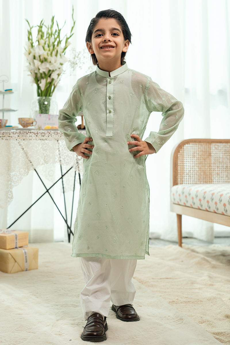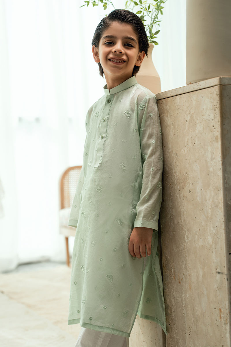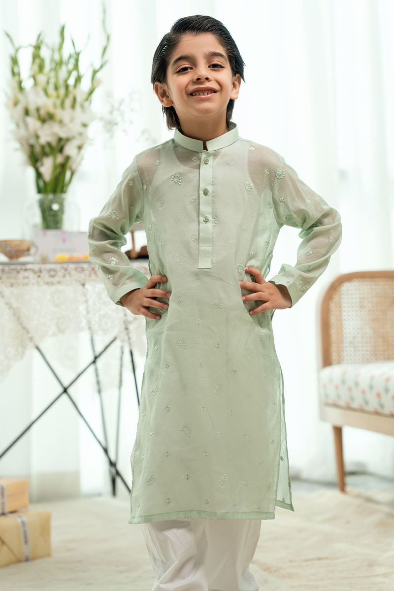 A statement mint kurta crafted on a sheer, lightweight fabric, delicately adorned with subtle hand-embellished motifs. The modern silhouette and refined detailing create a fresh festive look that feels both contemporary and traditional. Styled with white shalwar, this kurta is ideal for Eid celebrations and summer festivities.