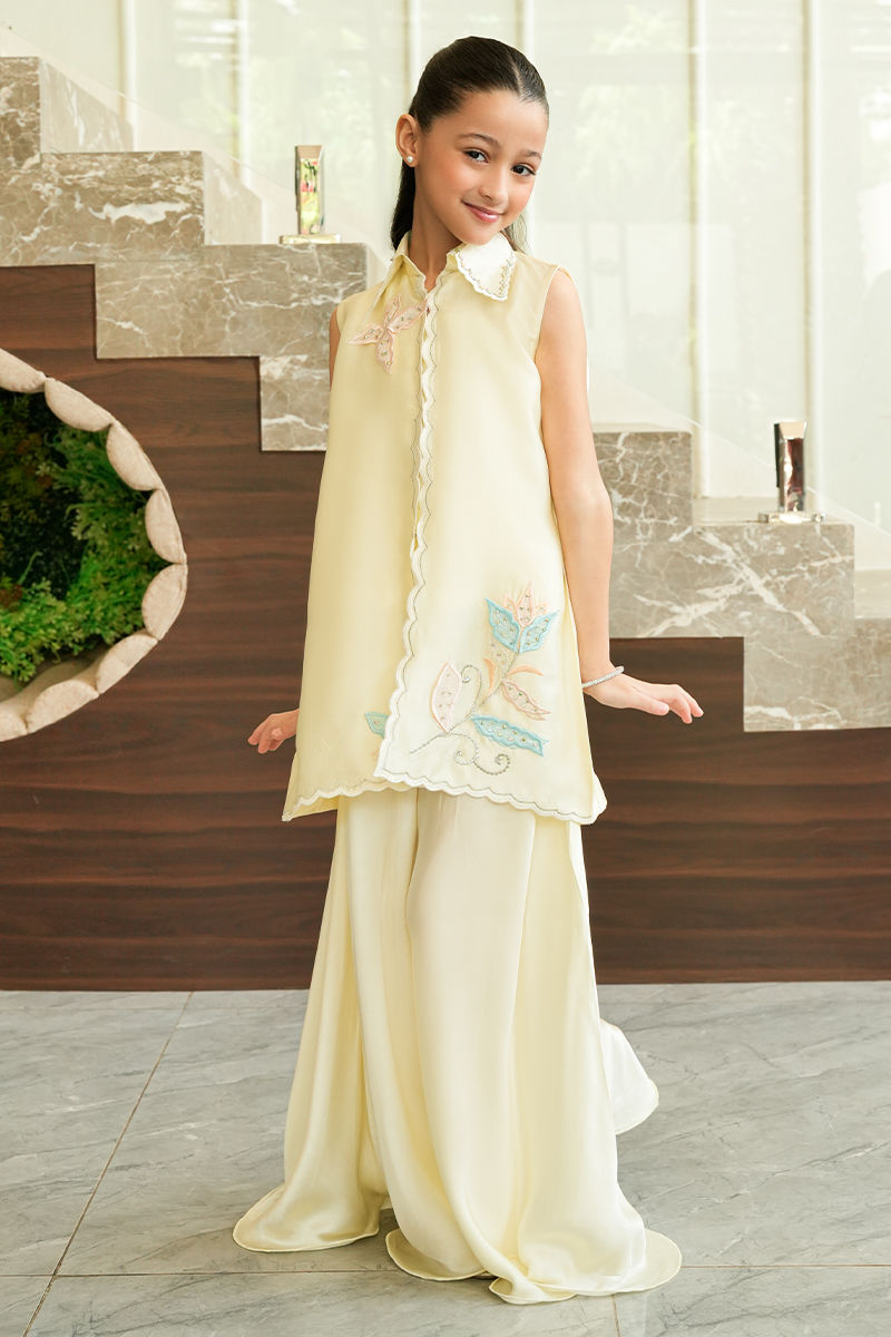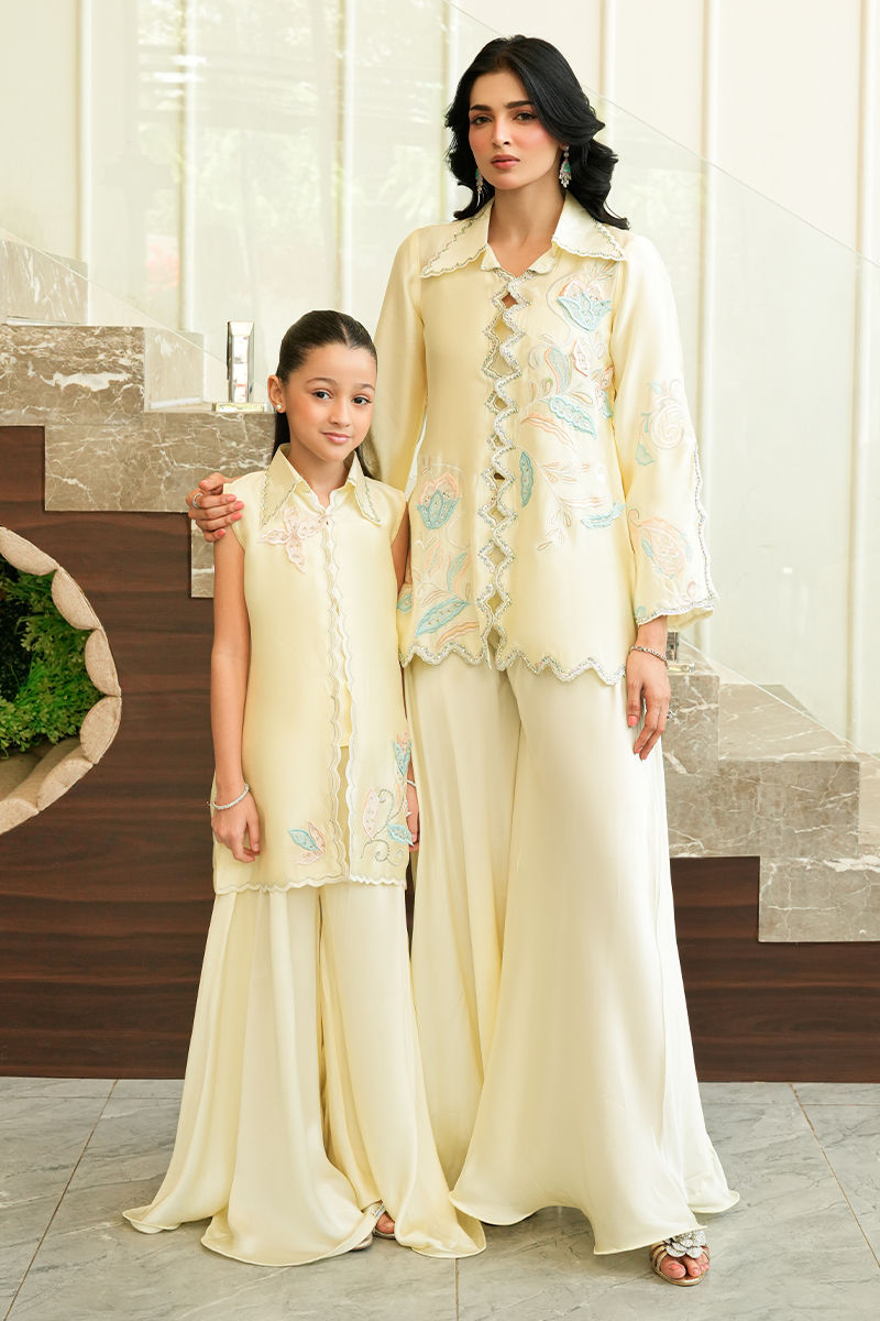 A refreshing pastel yellow mommy and me ensemble adorned with delicate floral embroidery in soft blue and blush hues, elevated with intricate scalloped detailing. Paired with fluid wide-leg trousers, the silhouette flows with graceful ease balancing effortless sophistication with a touch of playful charm.