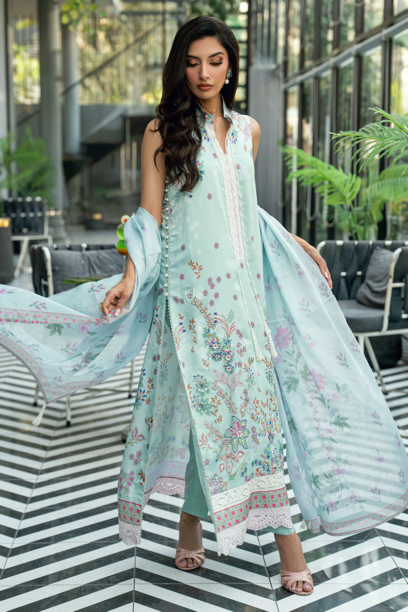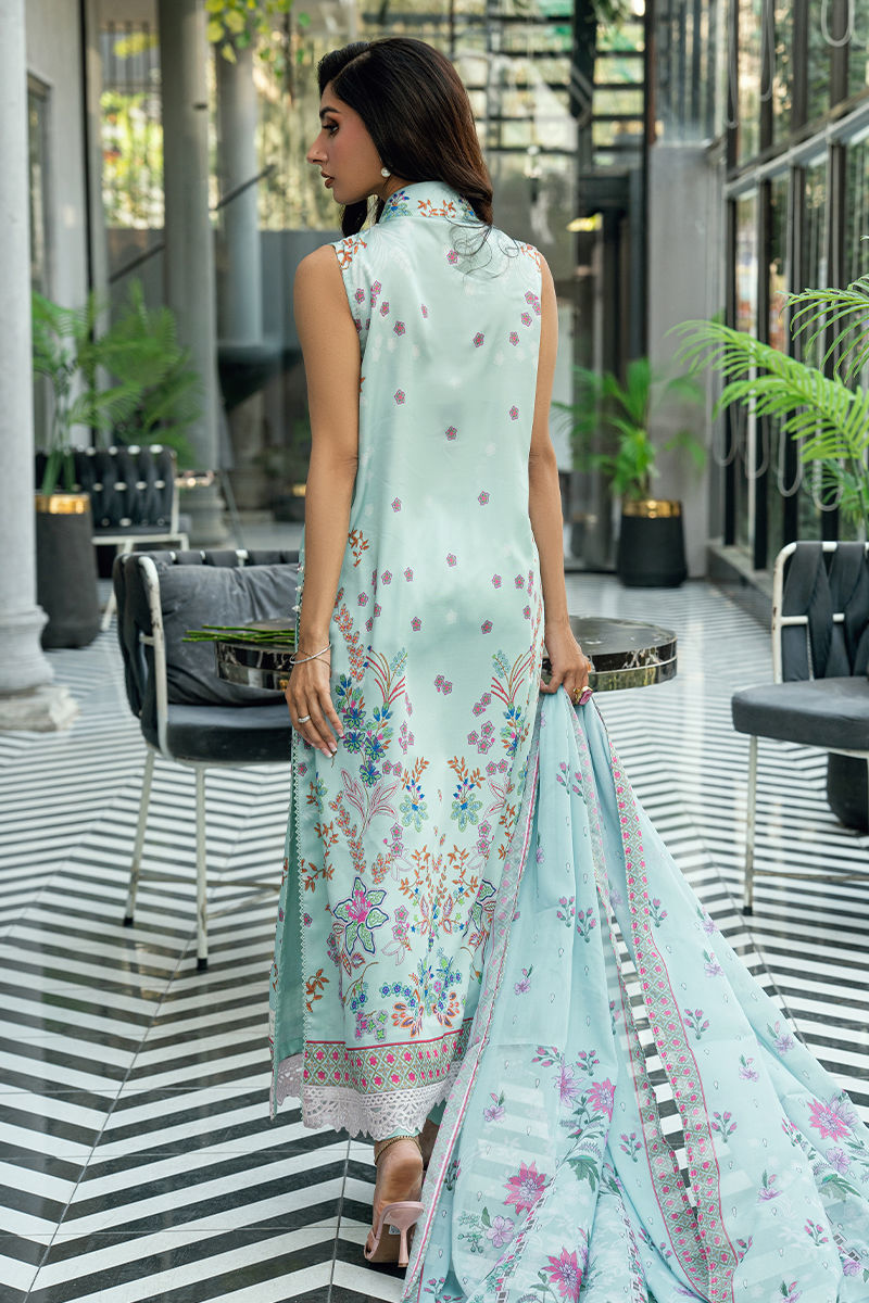 This elegant three-piece outfit is crafted in a refreshing mint–aqua base, adorned with delicate digital floral prints in soft shades of blush pink, lilac, lavender, muted coral, ivory, and subtle hints of sage green. The color palette feels light, feminine, and refined—perfect for graceful daytime dressing. The long shirt features a beautifully embellished front panel, enhanced with fine detailing and finished with delicate tassels at the neckline, adding movement and artisanal charm. Intricate lace detailing at the hem and trouser cuffs elevates the look with a soft, couture-inspired touch. The ensemble is paired with a matching digitally printed dupatta, finished with coordinated borders that complete the design seamlessly. Designed for elegance and comfort, this ensemble is ideal for festive daywear, Eid celebrations, summer gatherings, and semi-formal occasions. Product Highlights • 3-piece set: digital-printed long shirt, matching trousers & printed dupatta • Color palette: mint/aqua base with blush pink, lilac, lavender, coral, ivory & sage accents • High-definition digital floral print • Embellished front with tassel detailing • Lace finishing on hem and trouser cuffs • Lightweight, breathable fabric with graceful drape A timeless yet fresh ensemble for women who appreciate soft colors, delicate craftsmanship, and understated luxury.