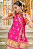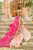 Beautifully blends traditional elements with a modern flair. The hot pink raw silk angharka shirt with intricate hand-embellishments, block print details, paired with an ivory rust screen printed silk gharara and a hot pink net dupatta is stunning. The use of kora, dabka, and threadwork along with the hand-blocked and zari embroidery details adds a touch of timeless elegance, while the contemporary styling keeps it fresh and vibrant.