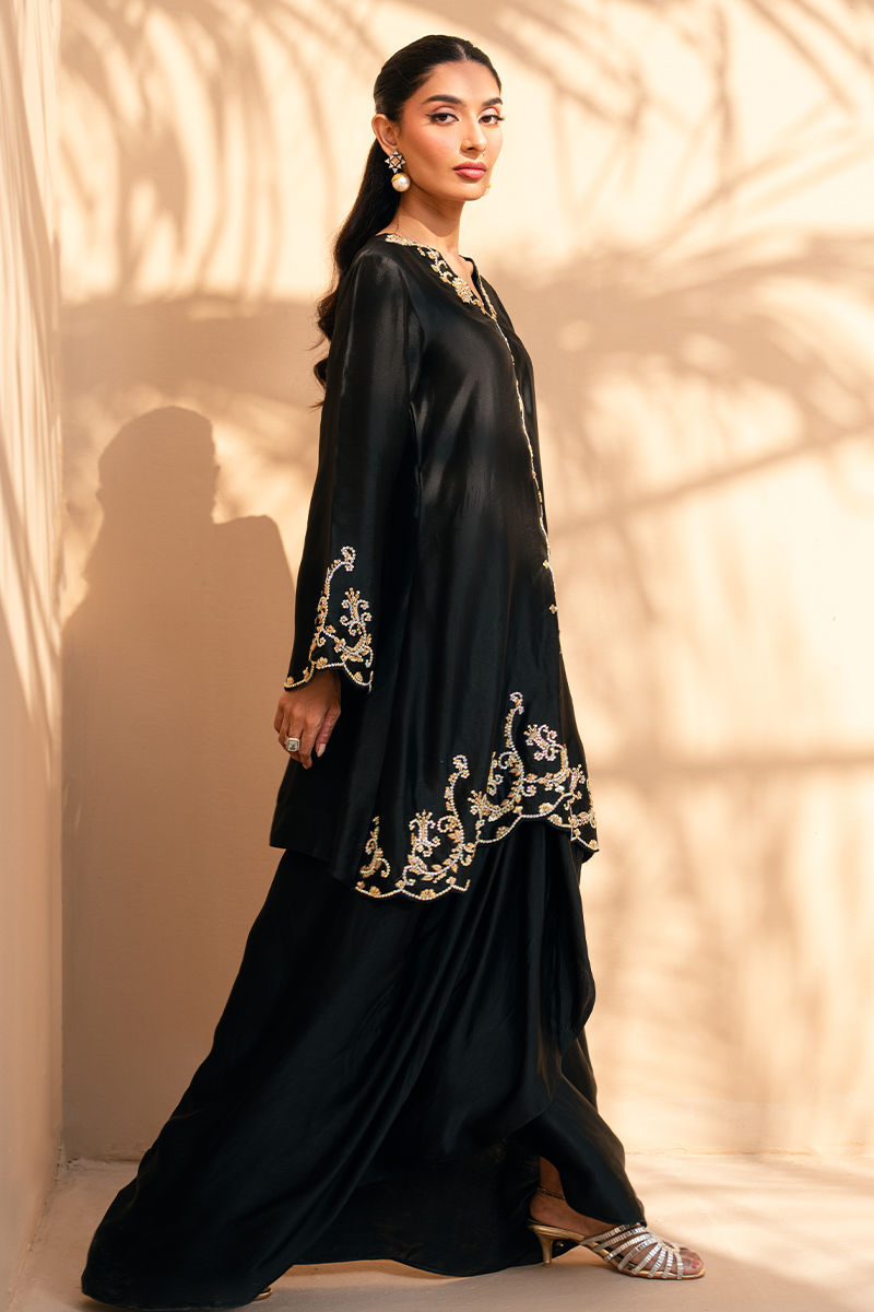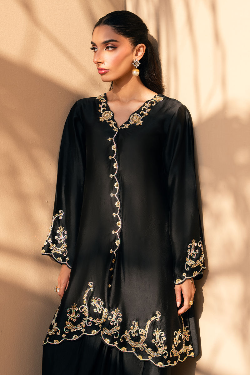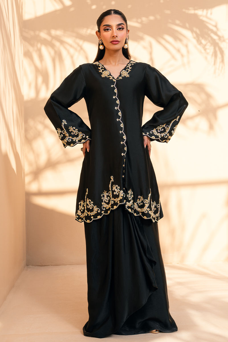 Classic with a romantic edge, this black long silhouette is designed for timeless appeal. Featuring intricate antique-gold embroidery tracing the neckline, sleeves, and scalloped hem, the outfit balances richness with restraint. The fluid drape of the fabric enhances movement, making it an elegant choice for formal evenings, festive occasions, or intimate celebrations. A true statement in quiet luxury.
