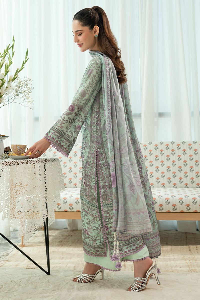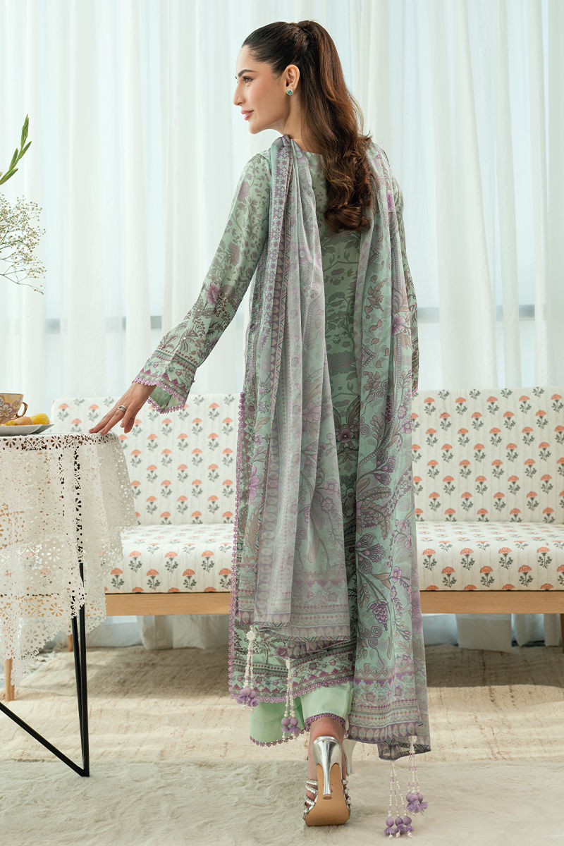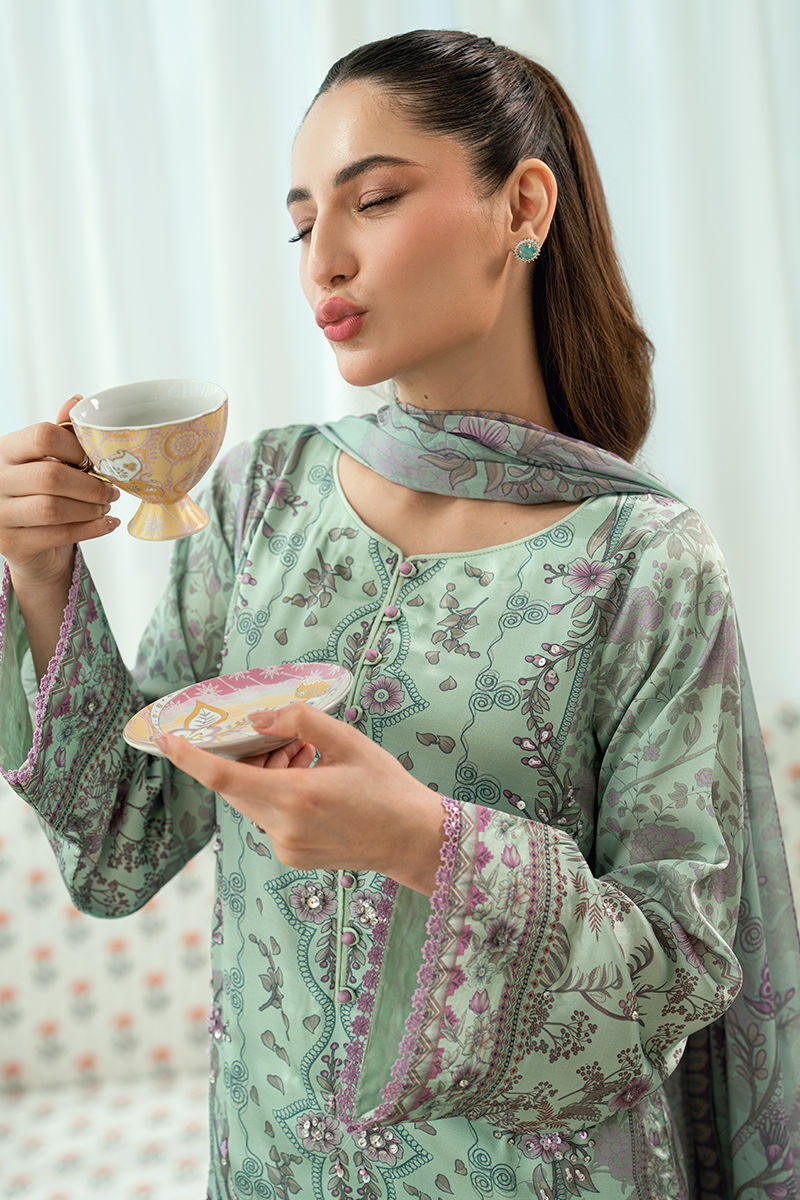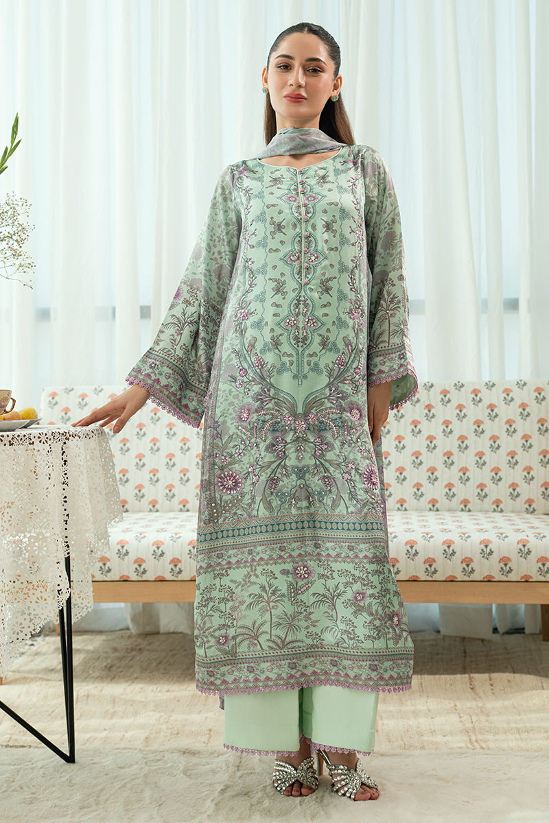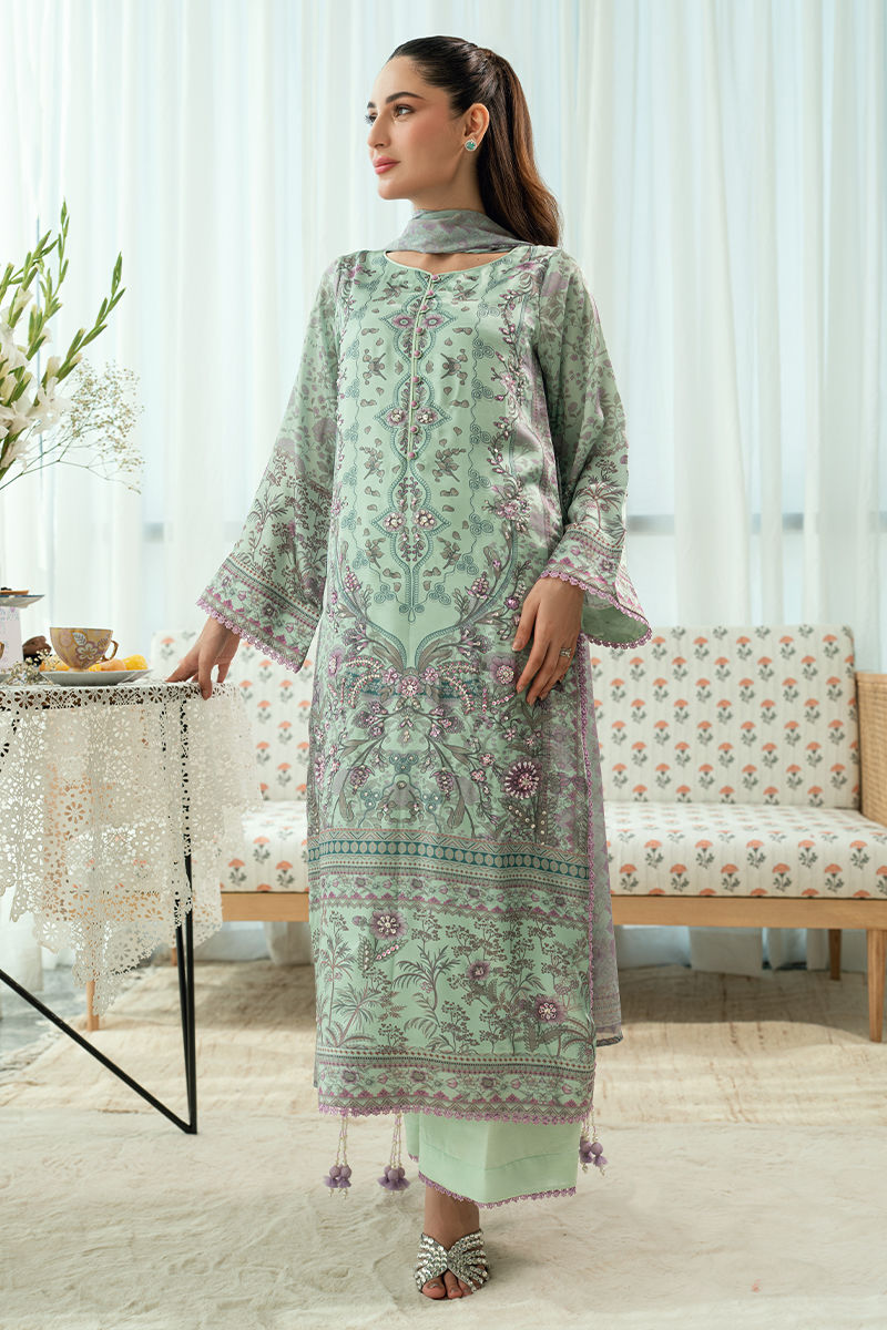Noorain is a serene mint ensemble featuring intricate all-over prints inspired by traditional motifs. The long shirt is elevated with ornate borders and a beautifully detailed neckline, giving it a statement yet balanced look. Finished with flared sleeves and paired with culottes pants, this outfit blends heritage aesthetics with modern elegance.