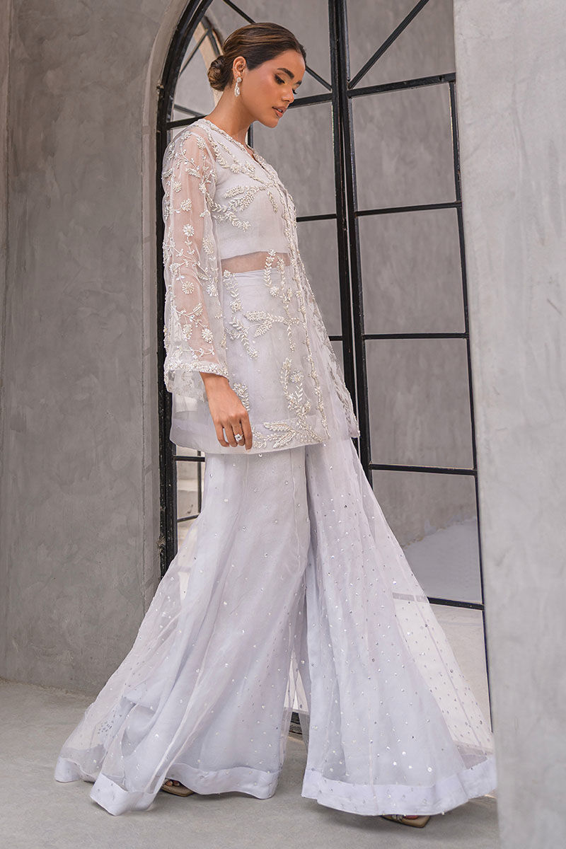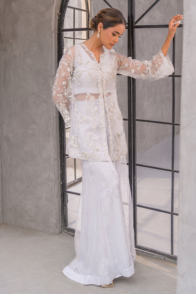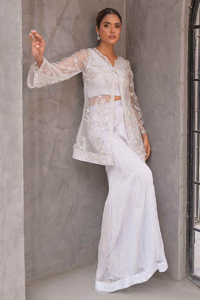 A graceful ivory-white ensemble exuding delicacy and poise. The sheer organza jacket, intricately adorned with pearls, sequins, and silver threadwork, is layered over a tonal inner and wide palazzo pants with subtle shimmer detailing. Light, airy, and radiant, this look is ideal for nikkah ceremonies, receptions, and sophisticated soirées